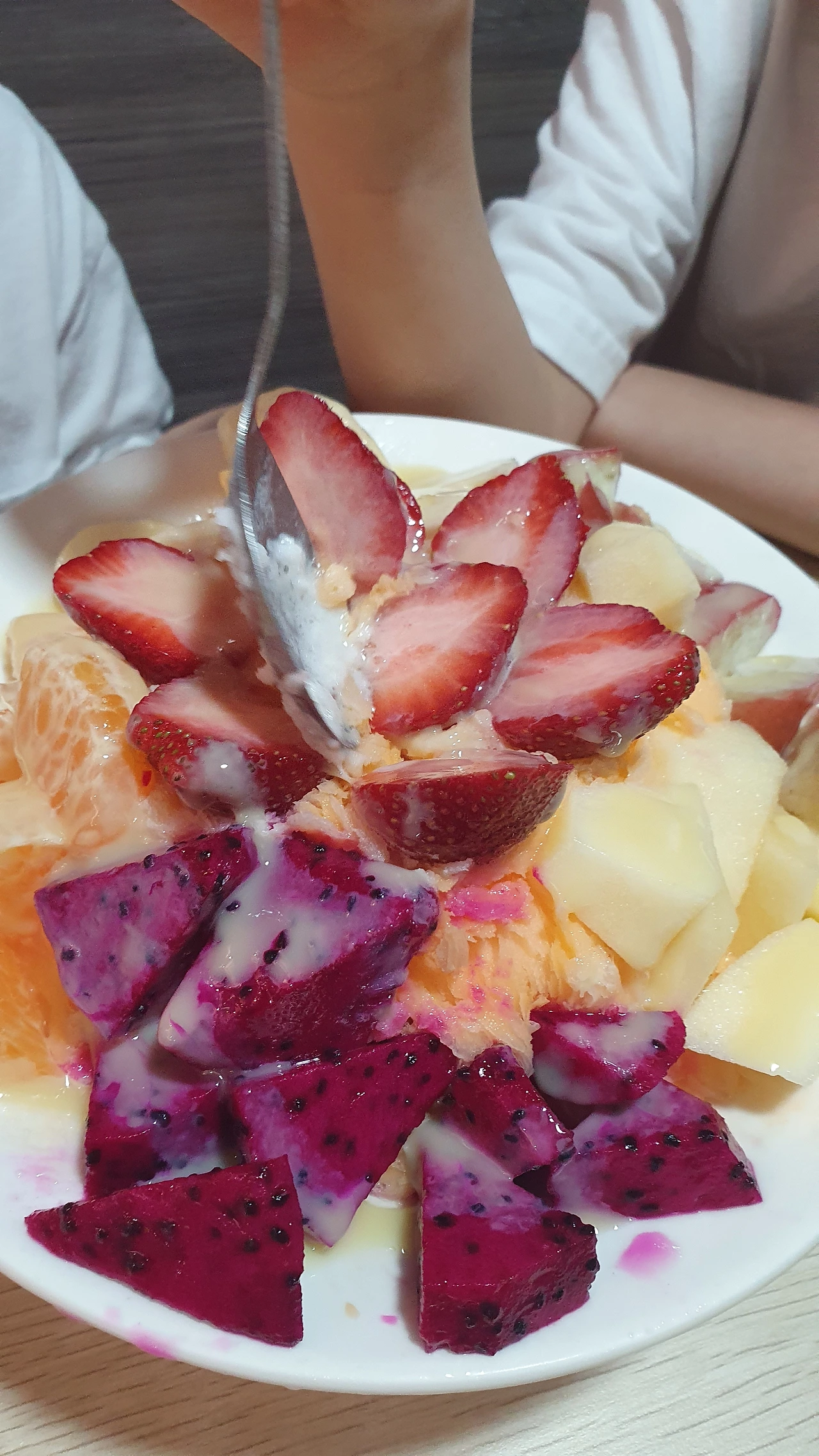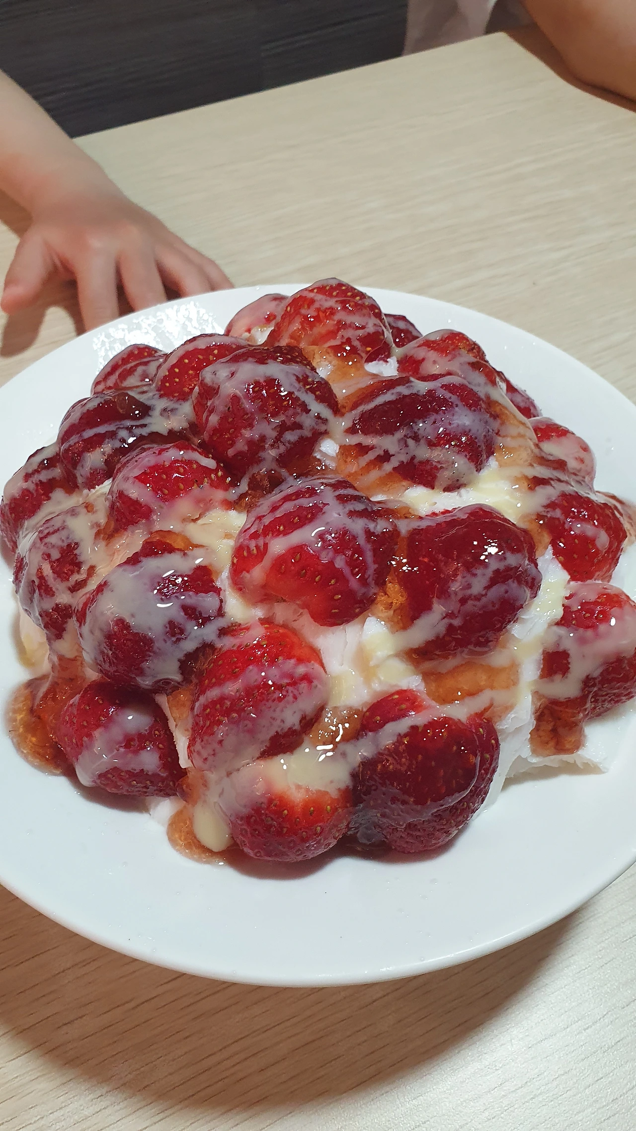 덥게 먹었으니 후식으로는 근처 빙수가게에서 빙수 두 그릇. 생과일 빙수인데 두 그릇에 만이천 원 정도, 못 보던 과일이 올라간 종합과일빙수보다 딸기 빙수가 애들입에 더 맞는 모양이다.