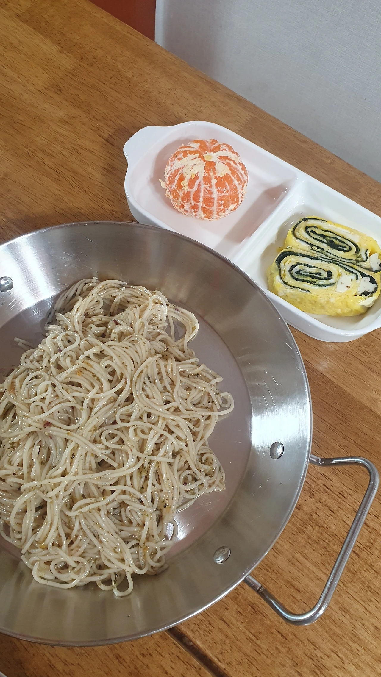 비빔국수를 먹기 좋게 담고, 먹고 남았던 계란말이를 꺼내 데우고 귤을 하나 준비 해 주니 한 끼 완성이다.