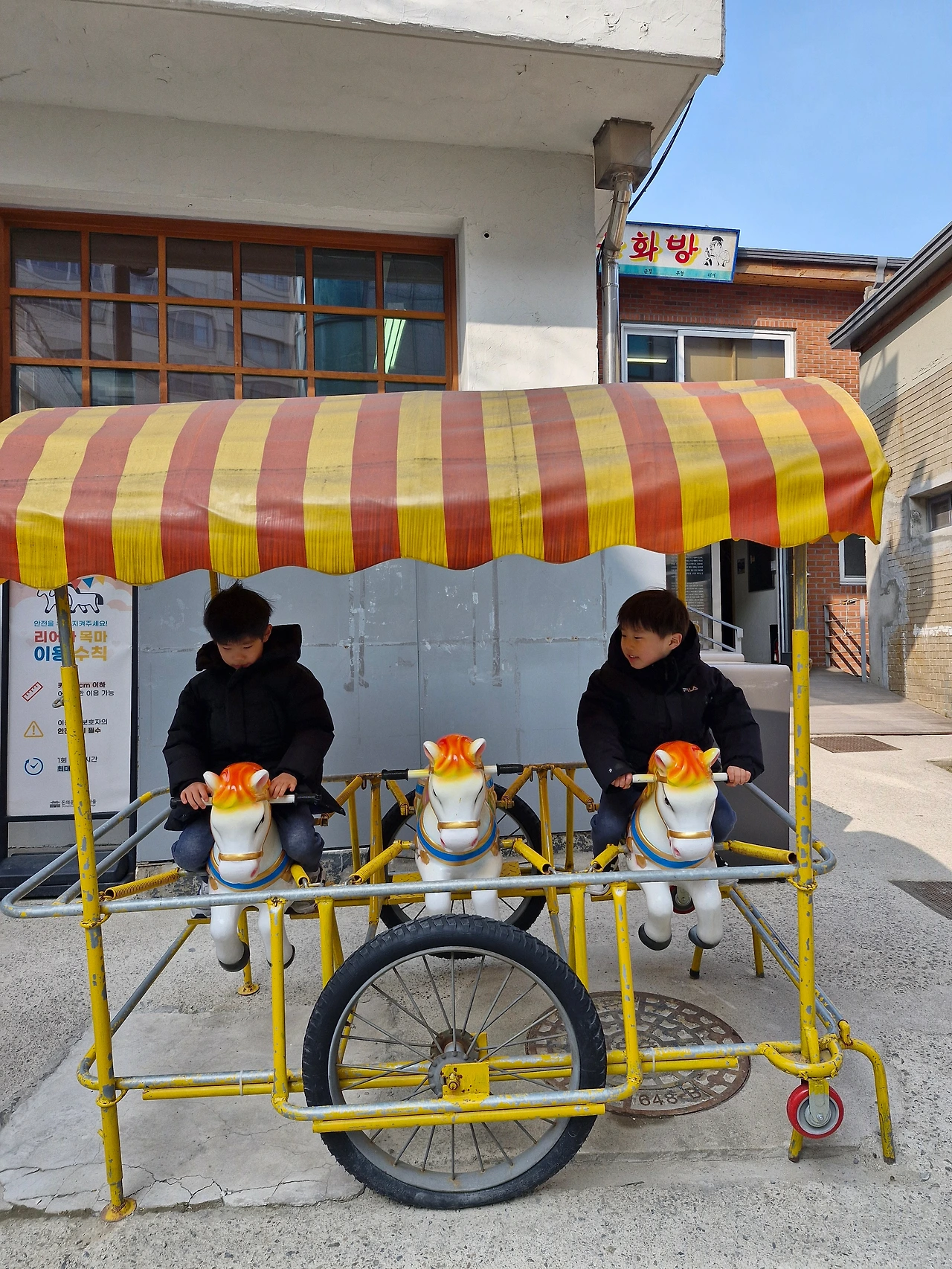말 할아버지가 와야 놀이기구를 체험해 볼 수 있었던 시절을 아이는 상상도 하지 못한다. 이런 걸 왜 타고 노느냐는 질문부터, 왜 놀이터가 없는지, 키즈카페가 없는지 일일이 설명해 주기가 힘들었다. 레코드판을 보고면서는 고길동 씨네 집에서 본 것이라고 말한다. (우리 아이들은 둘리의 광팬) 역사에 관심을 갖기 시작한 아이들에게 조선의 시대상을 보여주러 간 곳인데 어째 엄마의 어린 시절에 더 포커스가 맞추어진다. 나의 학창 시절이었던 90년대는 어느덧 30년 전이 되었고, 그것은 마치 내가 학창 시절 육 남매라는 프로그램을 보며 신기해하던 그 정도의 시간의 거리가 되어버렸다. 90년대의 30년 전이었던 육 남매, 2024년의 30년 전인 90년대, 내가 그렇게 옛날 사람이 되었나, 내가 태어난 80년대는 내가 느끼는 1950년대의 느낌일까, 그럼 우리 엄마 아빠가 그리워했던 6-70년대는 정말 우리 아이들에겐 내가 일제시제를 느끼는 시간의 거리일지도 모르겠다.