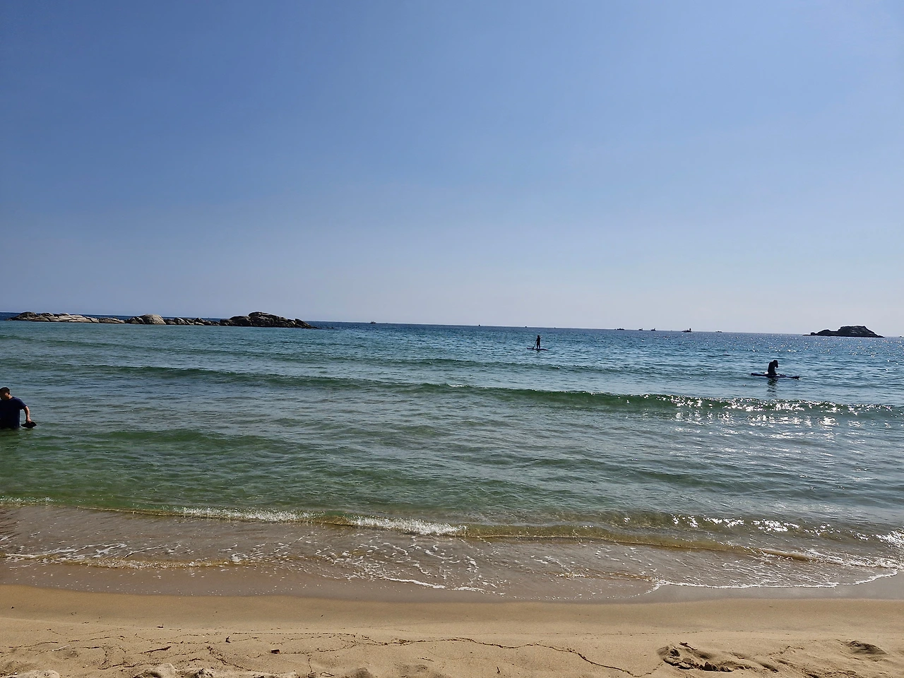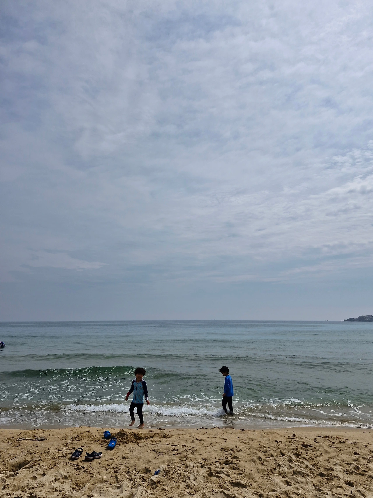 파도가 치고 물결이 일렁이고 아이들이 강아지처럼 뛰어다니고 조개껍데기가 반짝이는 모습. 바닷 물은 깊이를 더해가며 색깔이 바뀌고 하루해가 움직임에 따라 반짝임이 달라진다. 모래도 어떤 건 굵고 어떤 건 곱고, 조개껍데기도 하얗거나 회색이거나 각기 다르다. 어떤 이는 파도가 오면 맞닥뜨려 뛰어들고 누구는 파도가 오면 도망을 가고, 아니면 폴짝 뛰어 파도를 넘어보는 사람도 있다. 바다에 와서 마른 모래나 조금 만지작 거리고 있지만 사람 보는 재미 또한 쏠쏠하다. 굳이 내가 바다에 뛰어들지 않아도 아이들의 옷에서 머리에서 귀에서 모래를 털어줘야 하고 짠물 먹은 수영복을 헹궈내야 하니 바다 놀이는 내가 차리고, 내가 치우고, 간 보며 한 입씩 먹어봐서 나까지 나서서 설거지 거리를 늘리고 싶지 않은 훌륭한 한 상차림이랄까.