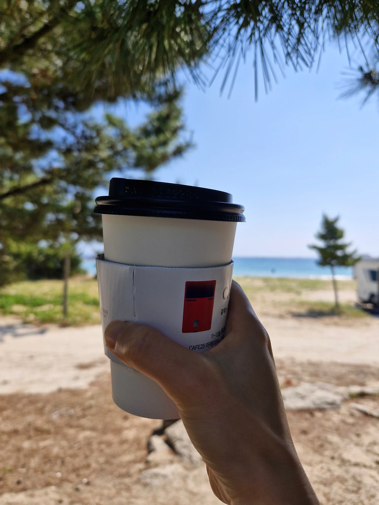 바다를 이렇게 본다. 어제와 날씨가 달라서 모습이 또 다르다. 속초, 고성 동해바다를 앞에 두고 바닷물 한번 안 적신 이번 여행, 나무 그늘 바위에 커피 한잔 들고 앉아 사람 구경 하는 재미로 마무리한다.