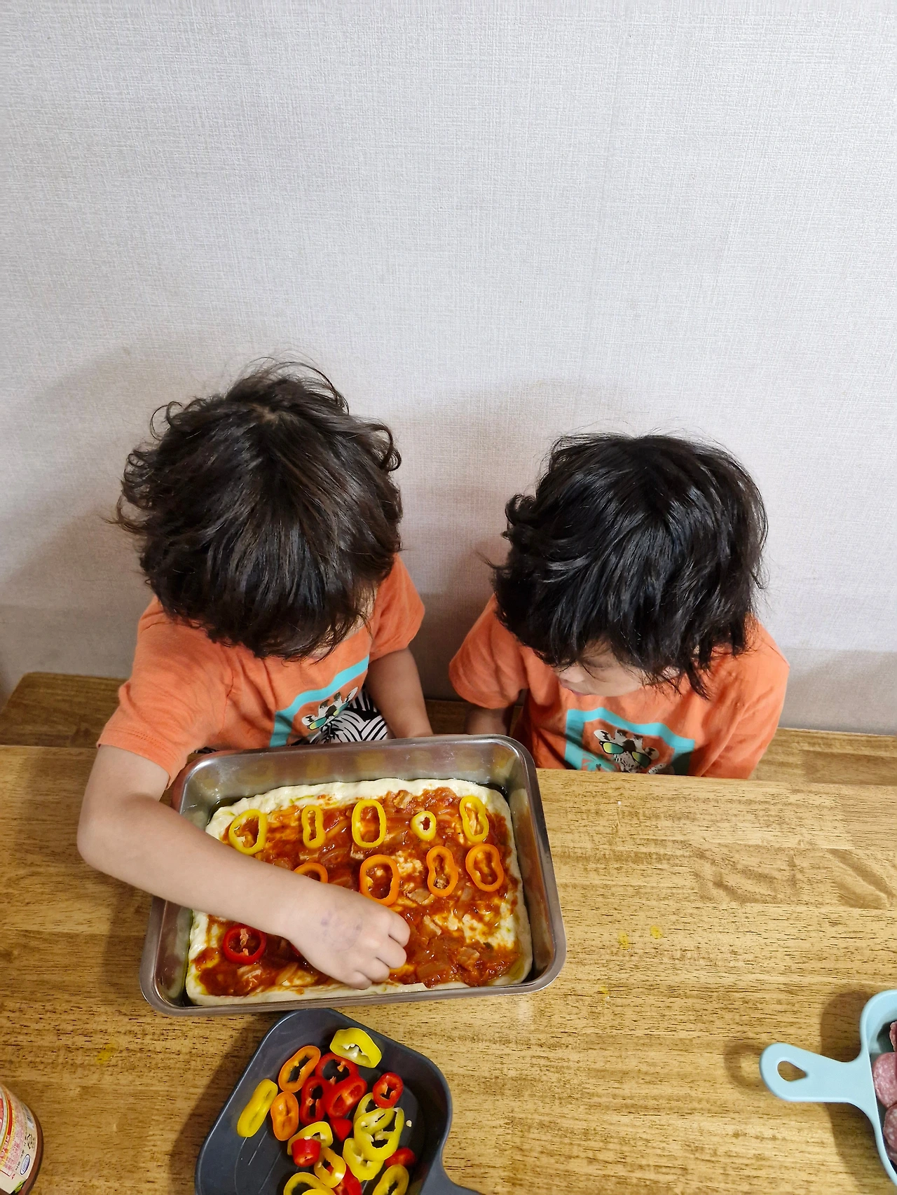 디트로이트 피자는 사각의 알루미늄 경질팬이 있어야 하는데, 처음 굽는 것이고 얼마나 해 먹을까 싶어서 전용팬을 구매하진 않았고 오븐 사용이 가능한 스텐 사각 밧드를 꺼내어 세팅을 시작했다. 팬에 올리브 오일을 듬뿍 붓고는 아이들에게 손으로 구석구석 바르라고 하니 미끌미끌한 감촉을 느끼며 순식간에 임무 완료, 그리고는 금세 부풀어 오른 반죽을 꺼내어 펜에 늘려 펴게 하였다. 탄성이 좋아 잘 안 늘어나는 것 같지만 손가락을 피아노 치듯이 세워 콕콕 찍으니 구석까지 잘 펴진다. 그리고는 소스, 토핑, 치즈를 올리고 오븐 대기, 200도에서 15분 굽고, 치즈가 타는 것을 막기 위해 오븐 틀 제일 윗 칸에 트레이를 하나 올리고는 7분 정도 더 구웠다. 도우와 토핑이 넉넉하게 올라가 혹시라고 덜 익을까 봐 오븐샤워를 조금 오래 한 편이다.
