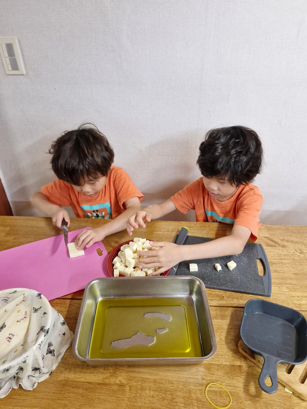 아이들에게 처음으로 칼과 도마를 내어 주었다. 코스트코에서 사 온 1킬로짜리 몬트리잭 치즈를 숭덩숭덩 썰어 놓고 아이들에게 깍둑썰기를 시키니 곧잘 해 낸다. 손 힘이 아직 약한 둘째가 처음에 조금 힘들어했지만 금세 요령을 익히고 하얀 깍두기 모양으로 썰어 한 접시를 만들어 놓았다. 그리고 소스로는 지난번 먹고 남은 토마토 파스타 소스에 케첩을 조금 섞어 발랐고, 냉장고 속 재료, 오늘은 냉장고에서 너무 오래 지낸 파프리카 당첨이다. 색색으로 썰어 한 줄씩 늘어놓고 중간중간 이탈리안 살라미를 썰어서 채워 넣었다. 이탈리안 살라미도 냉장고에 오래 있었는데 이런 식품이 몸에 좋을 리는 없지만 유통기한이 길어 보관이 좋고 아이들이 짭짤한 맛을 좋아하여 가끔 피자를 구울 때 쓰느라고 항상 사 두는 재료이다. 한 번 쓰고 남은 것은 냉동 보관 하여 다음번 피자 만들 때에 쓴다. 우리 집은 적어도 한 달에 한두 번은 피자를 만들어 먹는 편이라 소진이 쉽다.