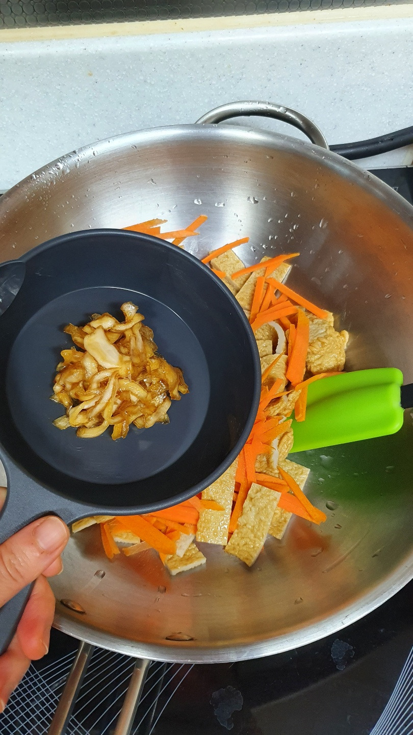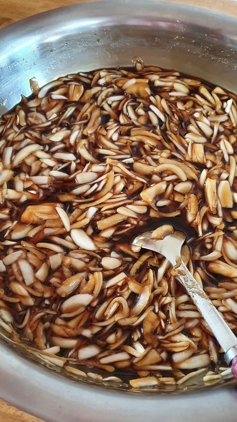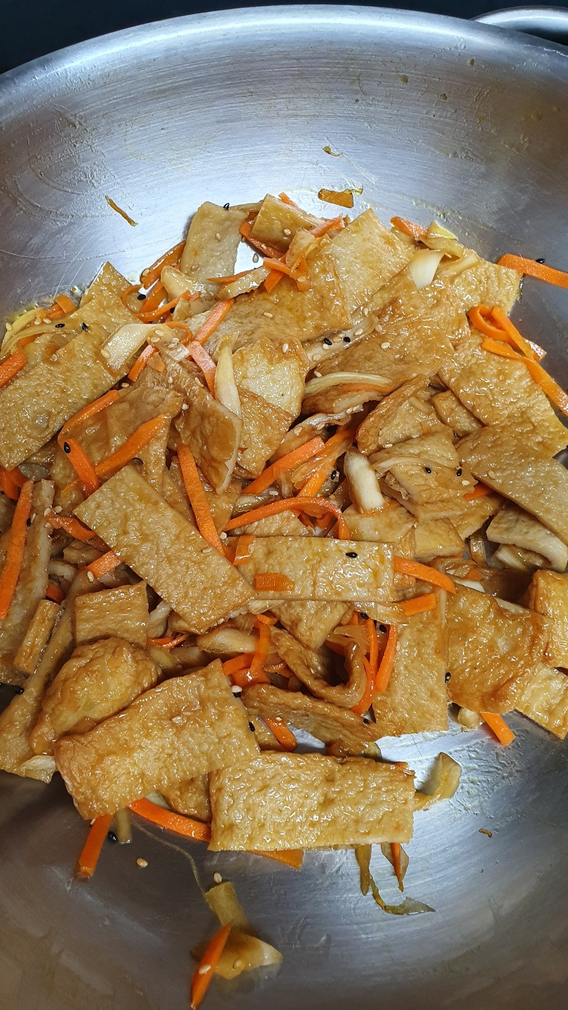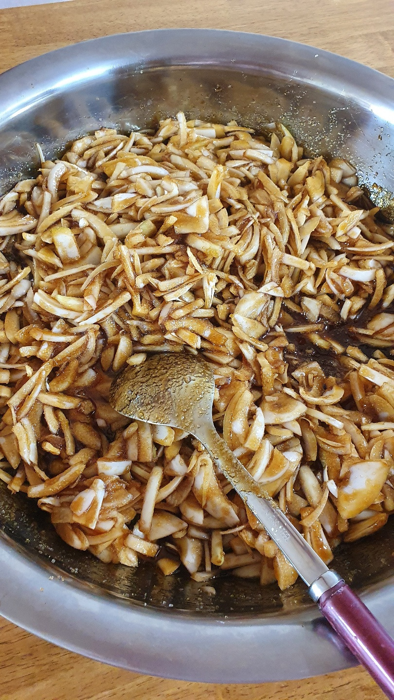 양파청은 새콤한 맛 담당이 아니고 달콤한 맛과 색깔, 수분 담당이라 너무 익어 신맛이 나기 전에 양파를 건져 내고는 냉장고로 옮겨 둔다. 그러면 각종 고기 요리, 조림, 볶음, 등등 단맛이 나야 하는 모든 요리에 사용이 가능한 조미료가 되는데 설탕이나 물엿보다는 양파 물이 섞인 이 액체를 주로 사용하는 편이다. 너무 발효되기 전 건져낸 양파 건더기들 먼저 요리에 사용한다. 설탕을 듬뿍 담고 있어, 불고기나 갈비 양념에 넣으면 좋다. 오늘은 어묵볶음을 만들건데 간장과 건져낸 양파만 사용해도 된다.