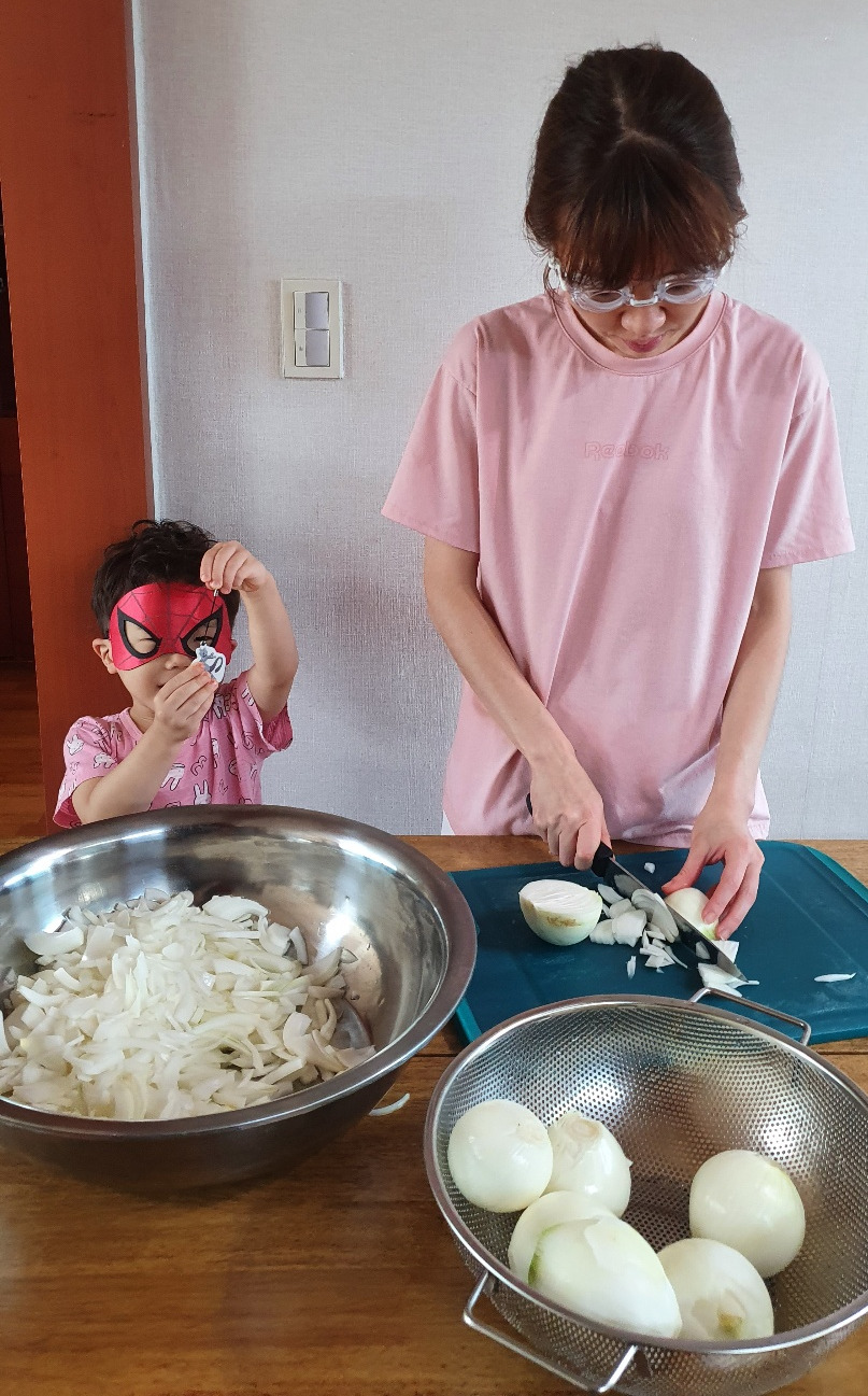 얼마 전 또 양파를 대량 잡았다. 나는 매실청처럼 양파청을 만들어 요리에 사용한다. 매실청은 양가 어머님들께 항상 얻어먹으니 한 번도 집에서 만든 적은 없는데 양파청은 얻을 데가 없어서 내가 만든다. 설탕은 비정제 갈색 설탕과 흑설탕을 반반 섞어 까맣게 만드는 편이다. 그러면 보통 간장 베이스의 반찬이 많은 우리 집에서 음식을 더 까맣게 해주는 효과가 있어 먹음직스러워 보이고 간장을 조금 덜 넣게 되는 효과를 내기도 한다. 만드는 방법은 그냥 양파를 썰어 넣고 설탕을 동량 아니면 약간 적게 넣어두면 알아서 물이 빠지며 설탕이 녹아 양파청이 된다. 이건 한 번 만들어 두면 정말 한참 동안 먹을 수 있어 아이 낳고 세 번 밖에 안 만들었다.
