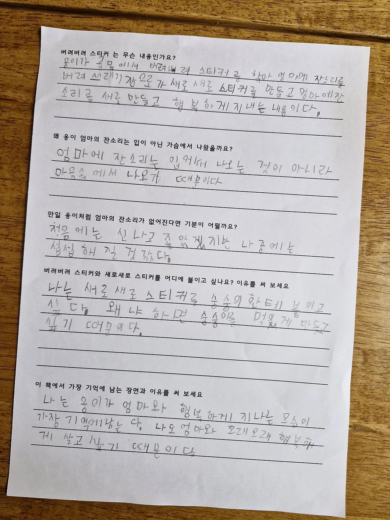 아이가 쓴 활동지를 읽다 보면 나도 모르는 생각을 하고 있었구나, 하고 느낄 때가 많다. 아직 저학년이라 활동지를 쓰라면 쓰는 나이이니 당분간 한 달에 한 두 권이라도 이렇게 독서 감상문을 받아내려고 한다. 더 크면 이런 글을 써서 엄마에게 보여주는 일이 없어질 것 같아서 벌써부터 아쉽기도 하다. 아이는 나랑 오랫동안 행복하게 살고 싶다 하니 건강하게 먹고 자고 즐겁게 살아야겠다. 고마워, 엄마 좋아해 줘서