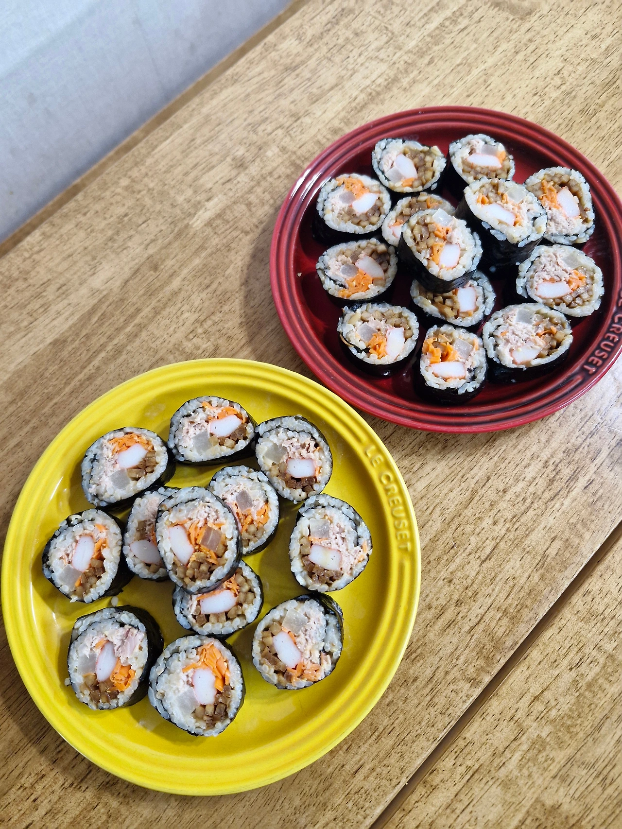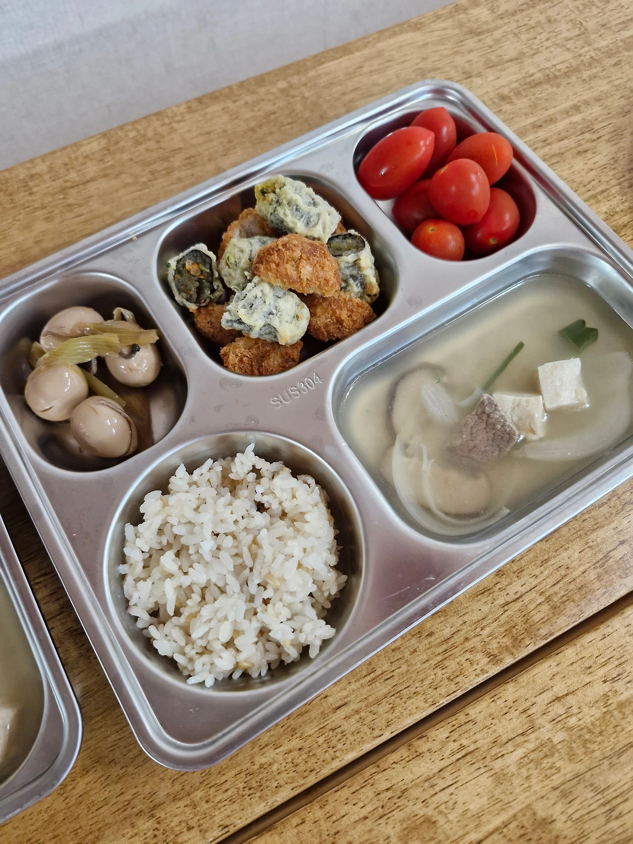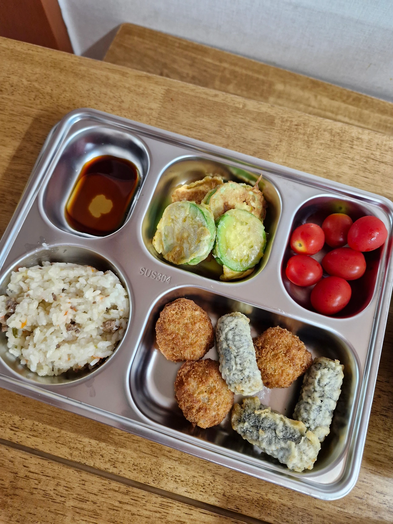 어른이라면 밥이며 찌개를 냉장고에 넣어 두면 알아서 덜어서 데워 먹을 수 있겠지만 아직 아이들이다 보니 전자렌지 사용을 금지하고 있어서 메뉴의 폭도 줄어들고 아이들이 음식을 맛있게 먹을 수 있는 골든 타임을 놓치는 것이 영 아쉽다. 일단 엄마가 즉석에서 해 줄 수 있는 면류 제외, 식으면 뻣뻣해지거나 마르는 음식, 기름이 하얗게 굳는 고기류 제외, 날씨에 따라 너무 습한 여름날 쉽게 상할 수 있거나 눅눅해 질 수 있는 음식들을 빼다 보니 정말 종류가 많이 없어진다. 유부초밥, 주먹밥, 볶음밥을 이렇게 자주 먹은 적이 있었던가 싶을 정도로 자주 먹었고, 물만두도 굽거나 튀겨서 챙겨 주었고, 엄마의 잔소리가 없으니 채소 먹는 양이 줄어서 계란말이에도 채소 듬뿍, 어떤 날에는 솥밥처럼 밥에도 온갖 채소를 다져 넣고 지어 주기도 했다. 카레나 짜장도 채소를 쉽게 먹일 수 있는 식단인데 따뜻하게 데워 먹을 수가 없으니 보온병을 준비했더니, 그것도 꽉 닫아두자니 아이들 힘으로 못 열어서 설렁하게 닫았더니 거의 식었었다고 한다.
