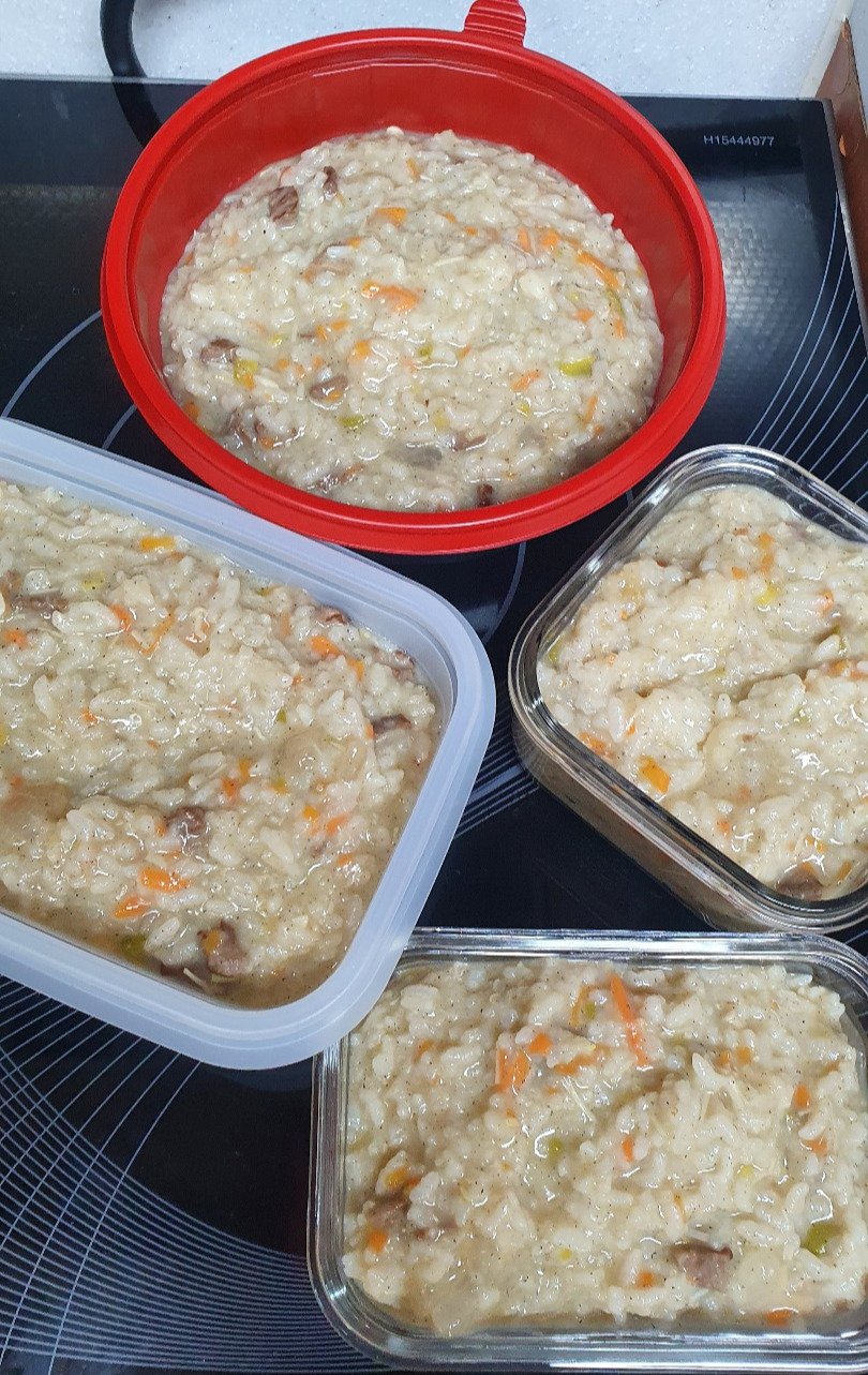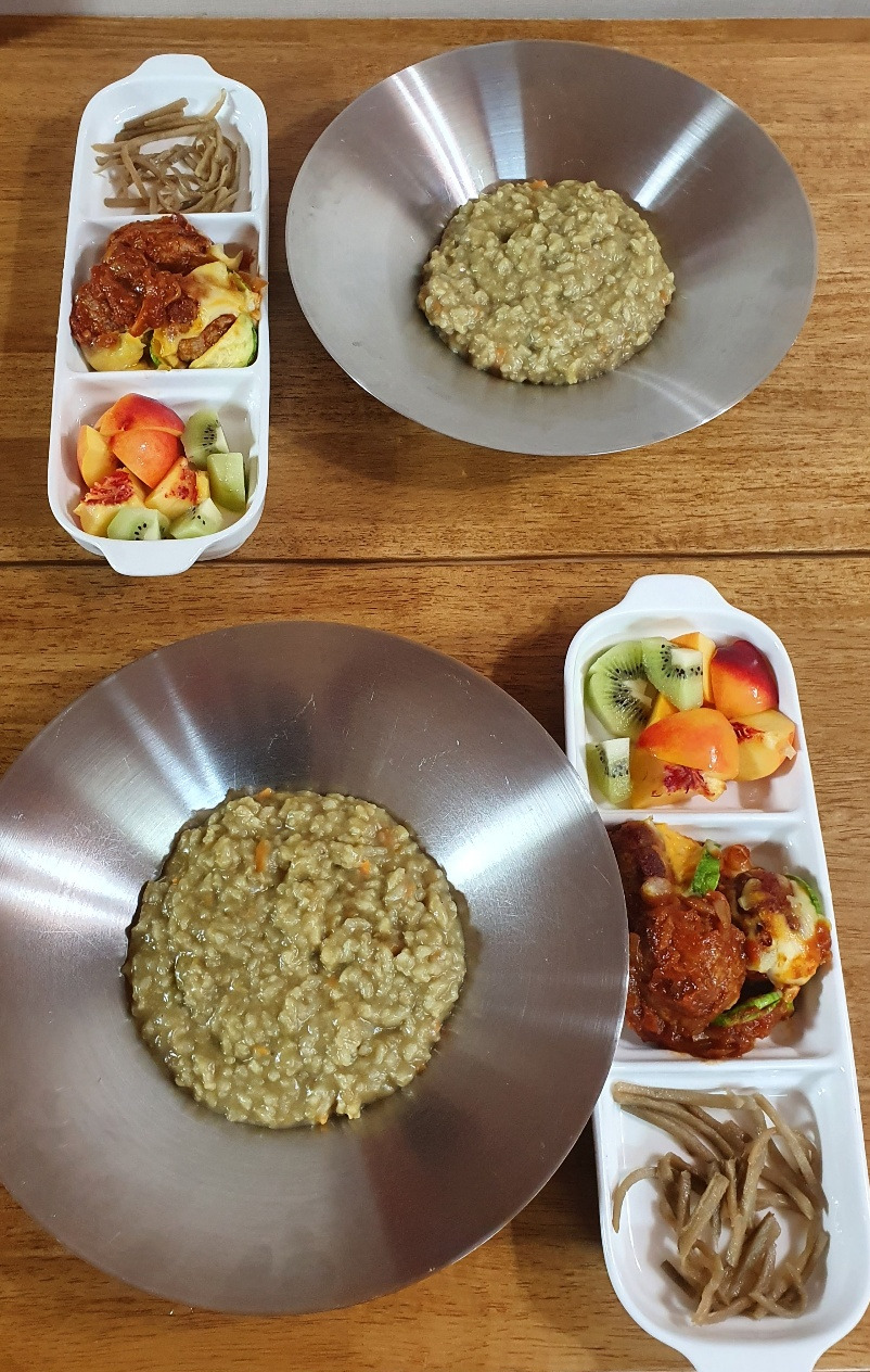 죽은 소화도 잘 되지만, 여러가지 재료를, 특히 채소와 고기를 동시에 먹고 먹일 수 있어서 좋다. 거기에 시어머니 협찬 국산 들기름 한바퀴 둘러주면 고소하고 부드러워 꿀떡꿀떡 잘 도 넘어간다. 다른 반찬 필요 없고, 영양소 고루 갖추어져 있고, 아이들이 잘 먹이니 내가 죽을 쑤지 않을 이유는 없다. 가끔 사 먹기도 하는데 먹는 입이 많아지니 집에서 만드는 것이 여러가지 면에서 실하다.