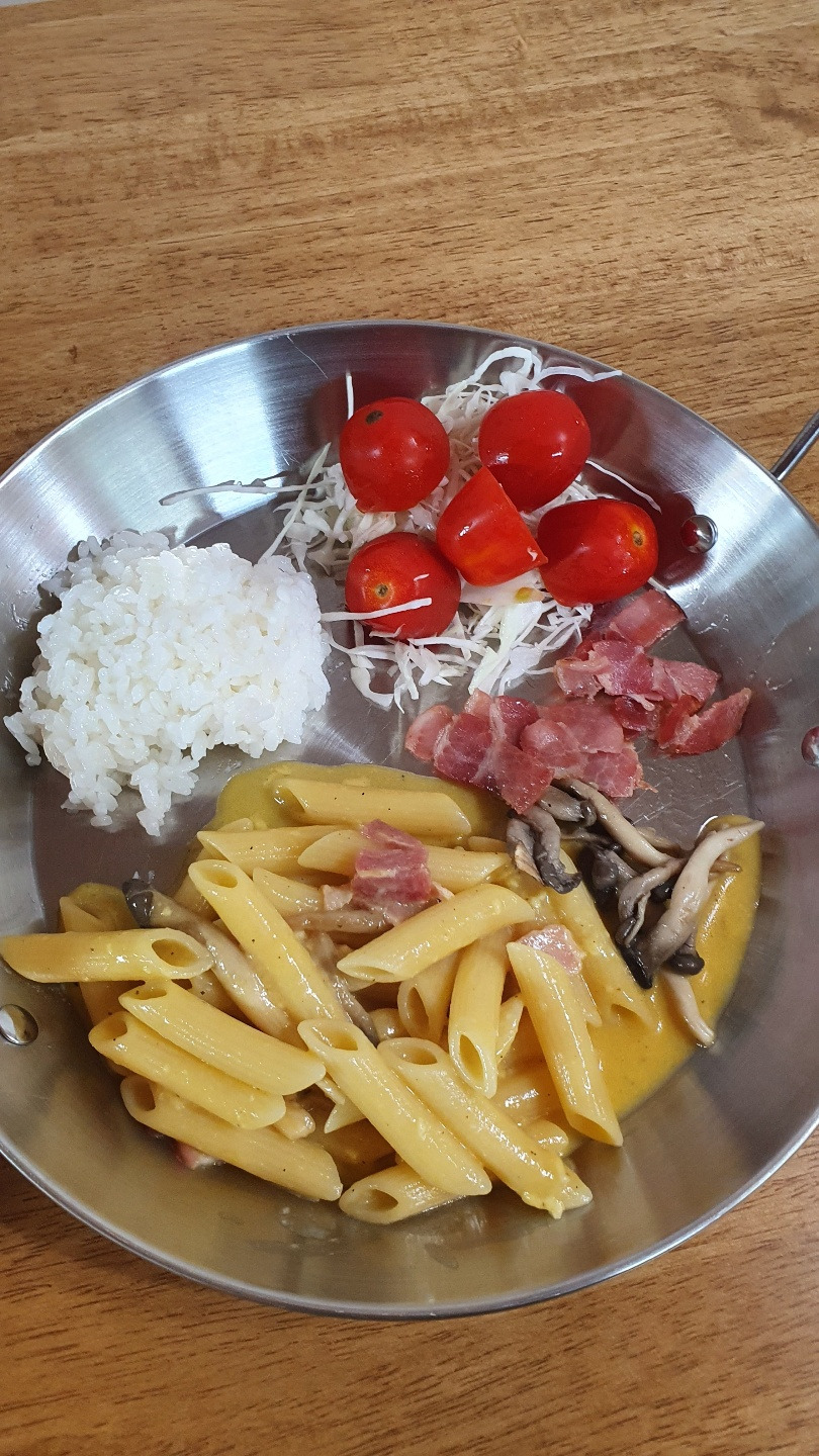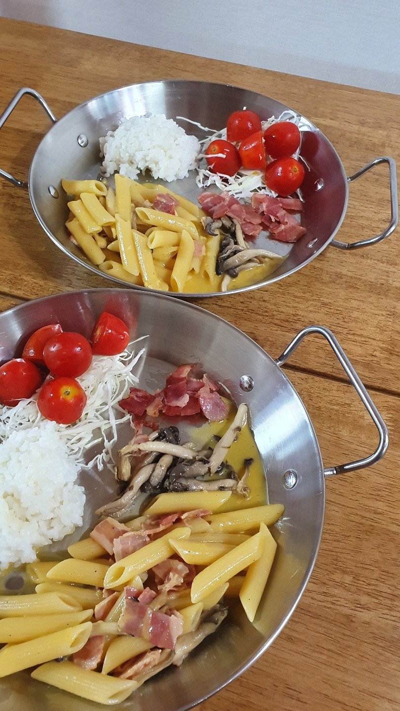 베이컨을 볶고 있으니 아이들이 코를 킁킁거린다. 함께 볶는 버섯도 먹기로 약속을 하고 계란 파스타를 만들어 주니, 작은 아이는 베이컨과 함께 먹을 하얀 밥을 달라 하고 큰 아이는 계란 소스에 비벼 먹을 하얀 밥을 달라 한다. 취향이 다른 아이들. 오늘은 한 그릇 음식으로 밥과 파스타 채소 샐러드를 함께 내어 주었다.