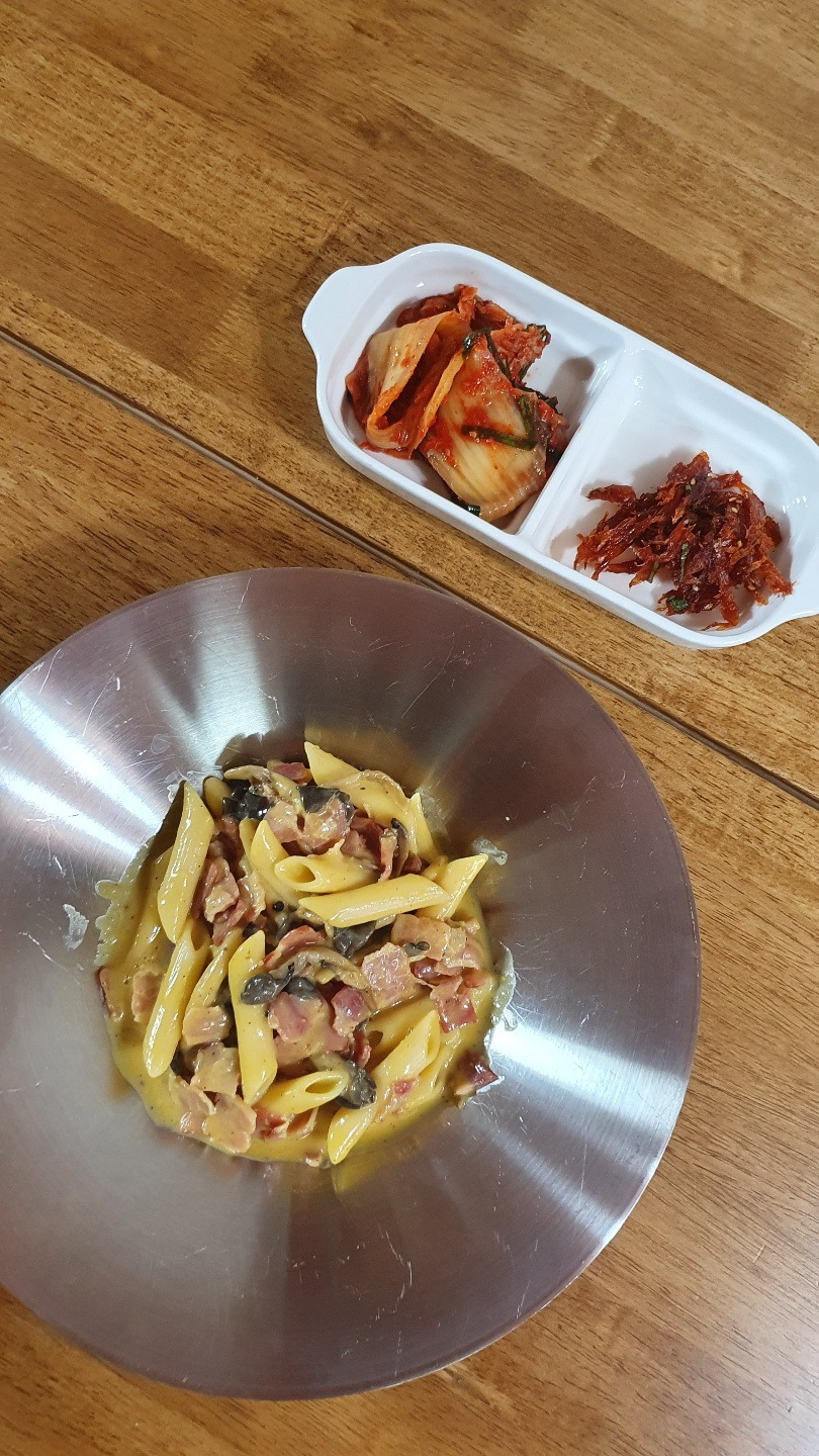 정말 고소하고 맛있는데 조금 느끼하긴 하다. 피클이나 할라피뇨가 있으면 좋겠는데 방울토마토에 양배추 샐러드와 먹으려니 못내 아쉽다. 신랑의 몫으로는 후추를 더 많이 넣고 앞접시에 빨간 반찬을 내어 주었다. 느끼한 파스타와 김치는 제법 잘 어울리는 궁합이다.