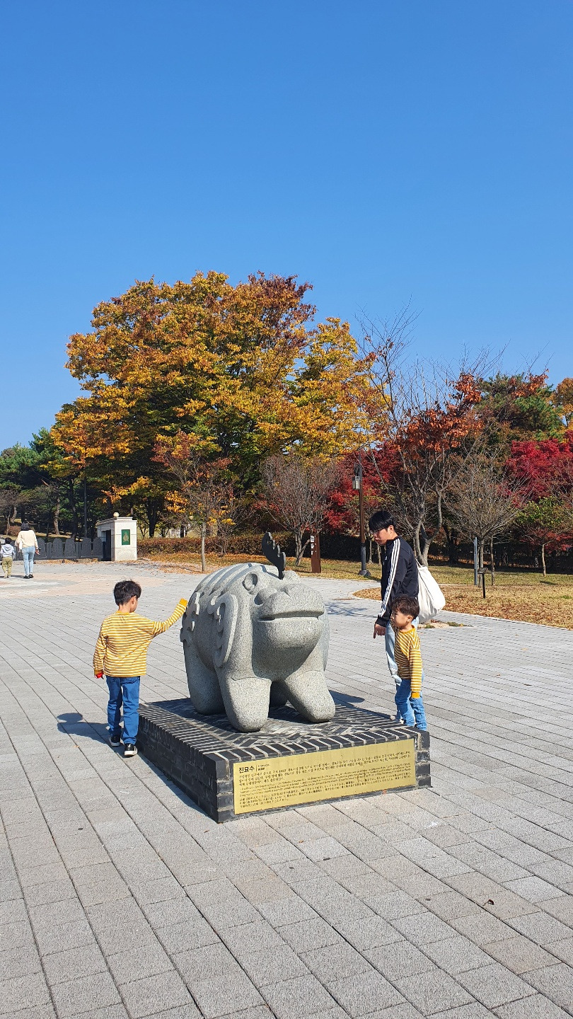 공주가 알밤이 유명한 곳인 건 알고 있었고 고속도로 휴게소의 공주 휴게소를 들른 적은 몇 번 있지만 공주에 방문한 것은 처음이었다. 무령왕릉도 처음이었는데 입구부터 꽃장식이 예쁘게 되어있었고 그래서 그런지 꿀벌과 나비들이 많이 날아다녀서 깊은 가을이지만 꼭 새 봄의 느낌이 나기도 했다. 매표소 근처에 있는 진묘수를 보고 눈이 휘둥그레지는 아이들, 무덤을 지키는 환상의 동물, 상상 속의 동물이라 한다. 옛날에는 죽은 다음에도 하늘나라에서 행복하게 살라고 예쁜 물건들, 보물들, 무덤을 지키는 동물들을 함께 묻은 거라고 설명해 주었지만, 아직 이해가 힘든 듯했다. 환상의 동물, 상상 속의 몬스터, 포켓몬과 비슷한 거라고 퉁쳐서 설명해 주었는데 그건 이해했을까.