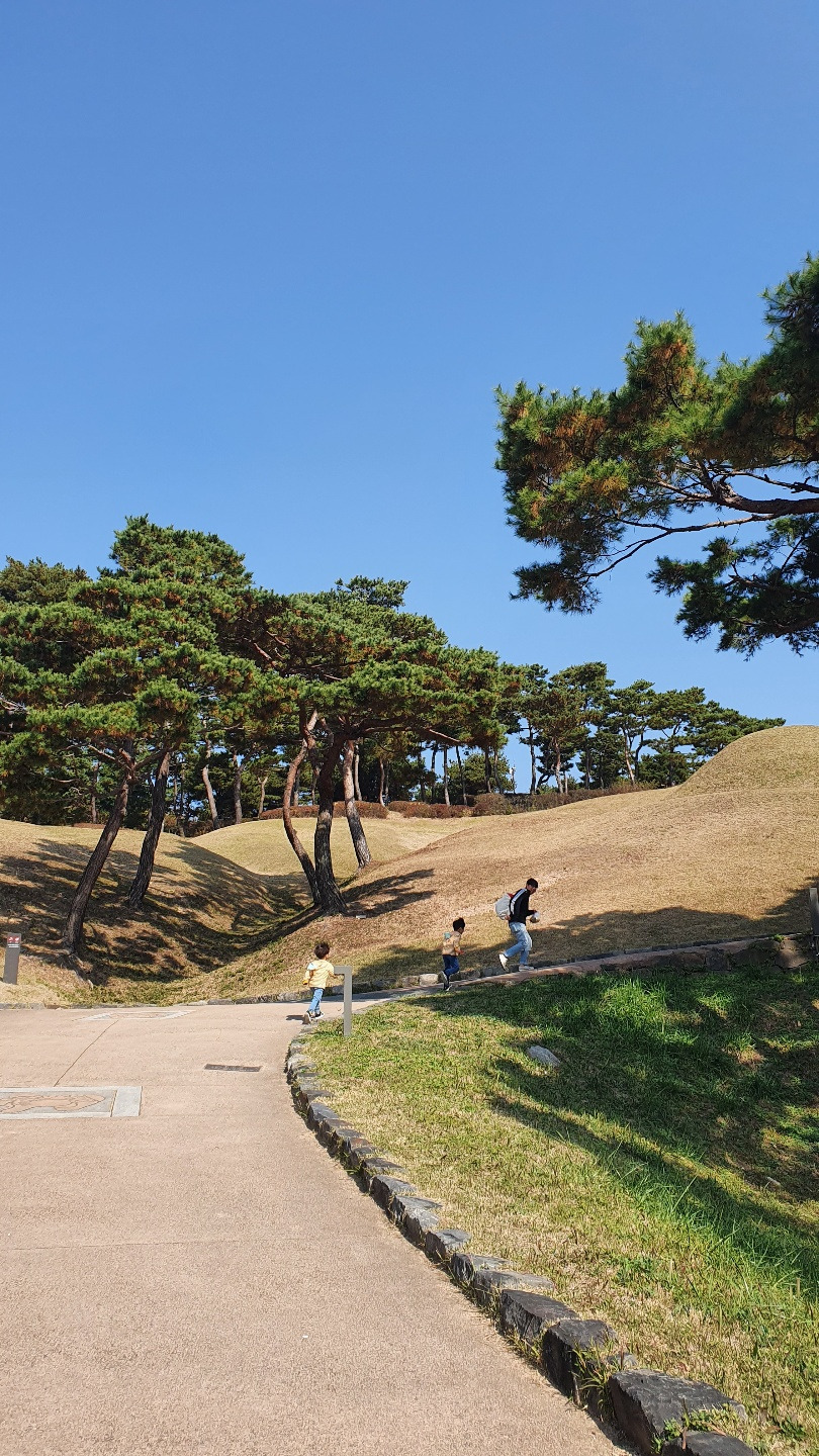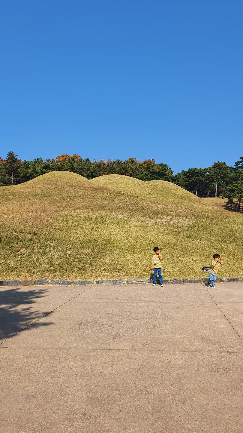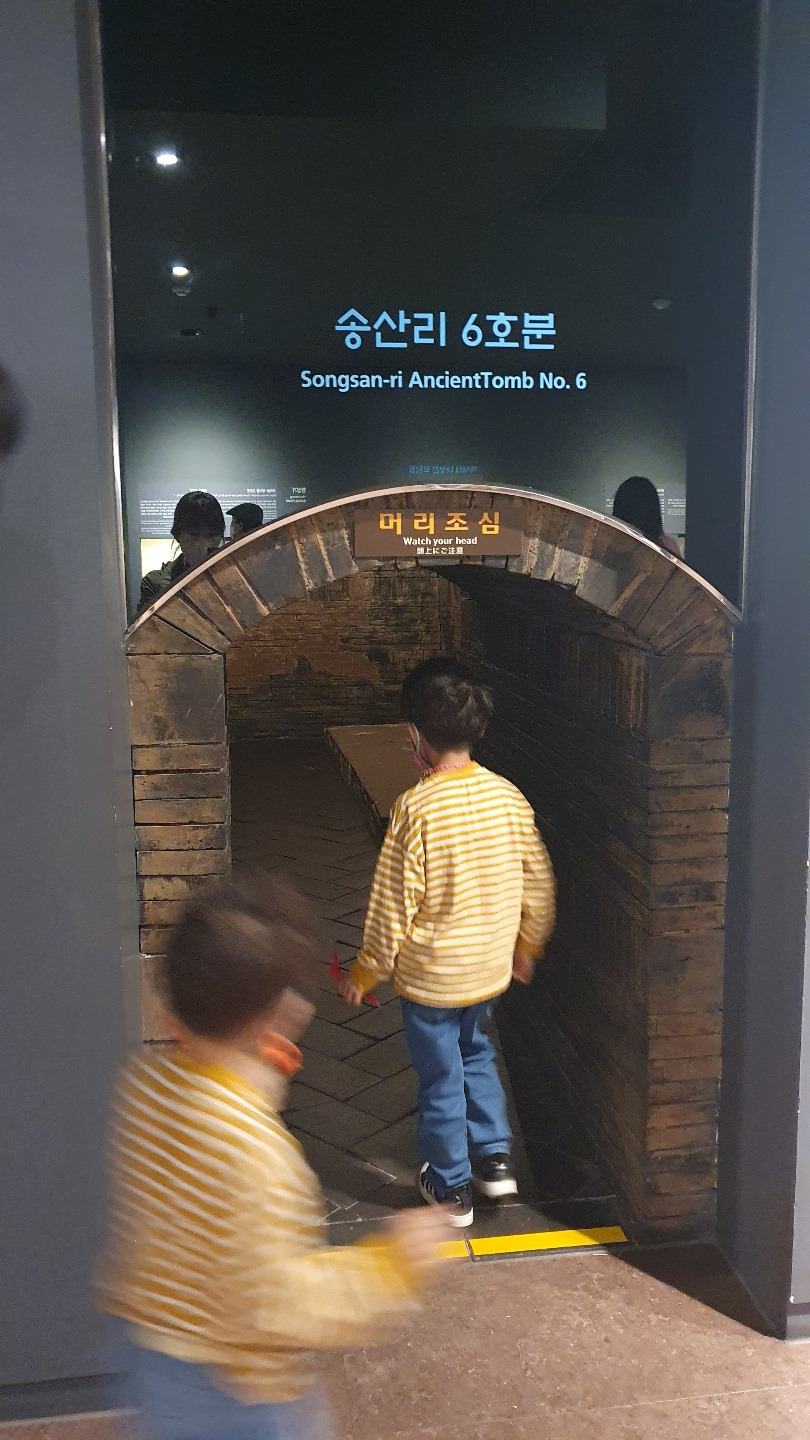 실제 고분에는 들어가지 못했지만 왕릉 전시관이 마련되어있어 아이들이 똑같이 재현한 벽돌무덤에 들어 가 볼 수 있었다. 무덤을 짓는 과정을 터치 스크린으로 체험하고 귀걸이, 신발, 왕관 등의 전시품을 구경하고 진짜 왕릉 산책을 했다. 경사진 언덕길을 올라가야 해서 조금 힘들다. 그러고 보니 우리 아이들은 실제 무덤을 본 적이 없다. 호국원이나 납골당에 가 본 적은 있지만 묘지에 가본 적이 없어서 일반 무덤이 얼만한지, 그래서 이 왕릉이 얼마나 대단한 건지에 대한 체감을 못 하는 듯했다. 너른 잔디밭으로 보이는지 자꾸만 들어가서 뛰어다니려 한다. 아빠의 제지가 이어진다. 들어가면 안 돼, 무령왕이 나와서 누가 내 무덤 밟았니? 이놈들!! 그러시면 어떡할 거야? 찌릿. 그게 아니고, 아이들이 이 무덤 위에서 다 뛰어다니면 이게 보존이 되겠니, 다 망가지면 이 소중한 문화유산이 망가지는 거고, 다른 사람들이 볼 수 없게 되는 거니까 뛰어다니면 안 되는 거지, 하고 세 남자에게 전한다. 애들 아버님은 가끔 이상한 논리를 아이들에게 펼친다.