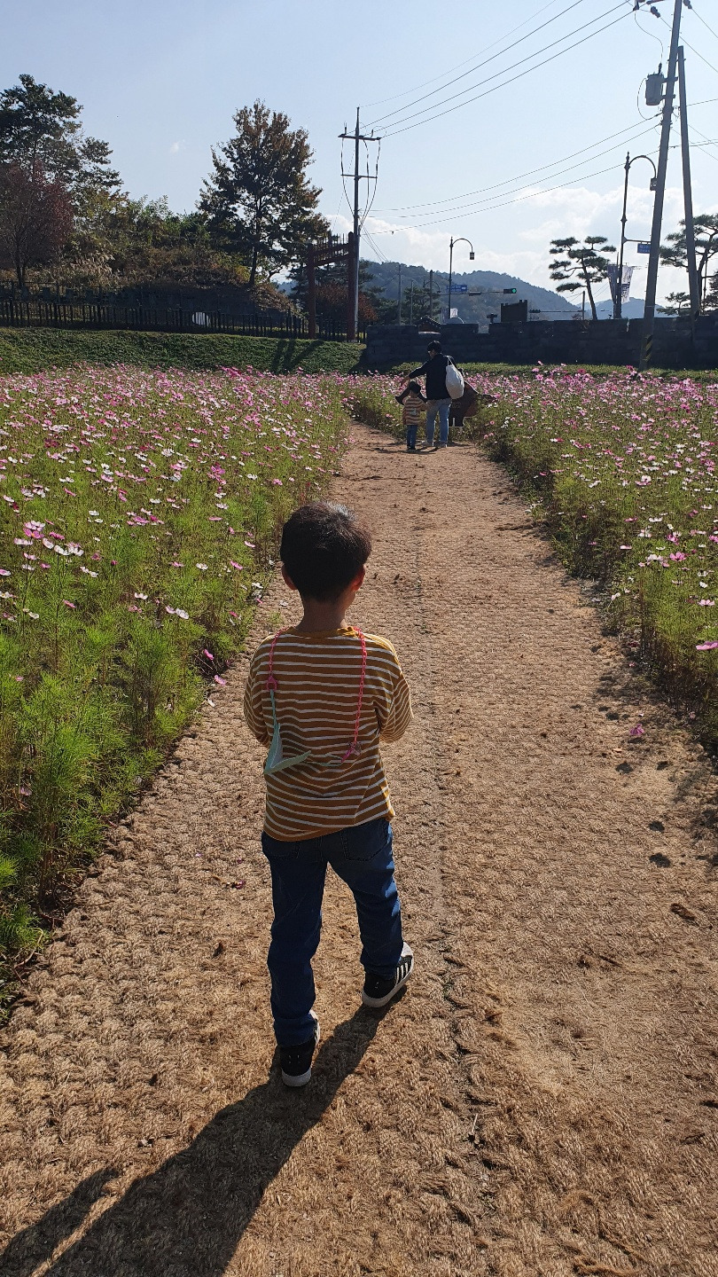 우리 동네에서 두 시간 남쪽으로 내려갔을 뿐인데, 공주는 아직 코스모스가 만발해 있고 초록 은행나무, 노란 은행나무가 섞인 초가을의 느낌도 있다. 지대가 높은 곳에는 단풍이 완연하고, 밑에 내려오면 아직 초록인 나무들, 그늘에 들어가면 서늘하다가도 햇볕으로 나오면 조금 더운 날씨에 산책하기는 아주 좋았다. 여러 계절이 섞여 있는 느낌이었다. 바스락 거리는 낙엽을 밟다가, 꽃밭에 날아다니는 호랑나비를 관찰하고, 코스모스를 구경하다가, 더워서 아이스크림을 사 먹는 날씨, 그러다 그늘에 앉으면 찬기가 들어 겉옷을 걸친다. 아름다운 가을날.