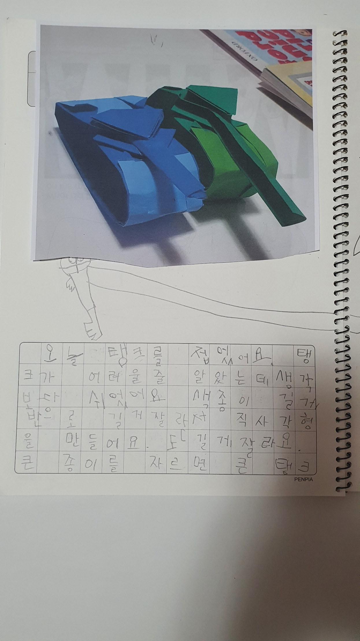 아이는 일기를 곧 잘 써 내려갔다. 일기 이기는 하지만 어느 날은 생물 도감이기도 하고, 동계 올림픽이 한창일때는 스포츠 중계 형식의 구어체로 독생물 배틀을 써 보기도 하고, 요괴외 몬스터에 빠져 있을 때는 몬스터 도감을 쓰기도 했다. 요즘에는 문장을 조금 더 멋지게 바꾸는 표현을 배우기도 한다. 예전에 색종이 탱크 접기를 했을 때 어려웠어서 오늘도 어려울 줄 알았는데 쉽게 접었다고 쓰고싶어. 아. 어려울 거라고 생각했는데 생각보다 쉬웠어? 라 말해주니 응. 생각보다 쉬웠어. 라고 말하고 엄마의 포인트를 캐치하여 생각보다 쉬웠다고 쓴다. 그럴 때는 참 기특하다. 옆에서 놀고 있는 줄 알았던 다섯살 짜리 둘째 녀석이 몇 시간 후에 엄마! 이거 생각보다 어려웠는데 쉬웠어 라고 말하는데 아까 들은 풍월을 읊어 대는 것이 너무 웃겼다. 아. 어려울 줄 알았는데 생각 보다 쉬웠어? 라고 하니 응, 생각보다 쉬웠어. 생각보다. 라고 말한다.