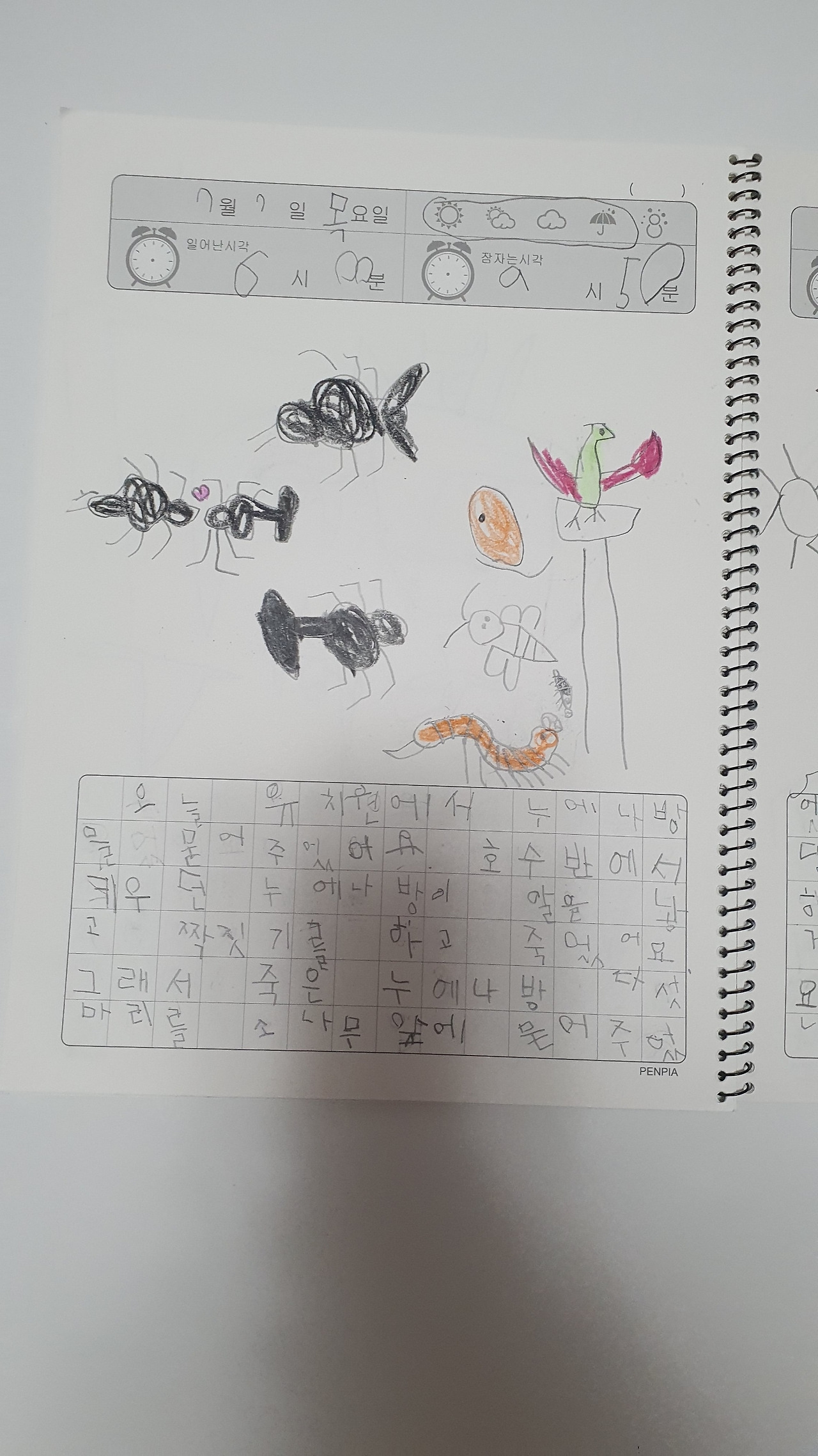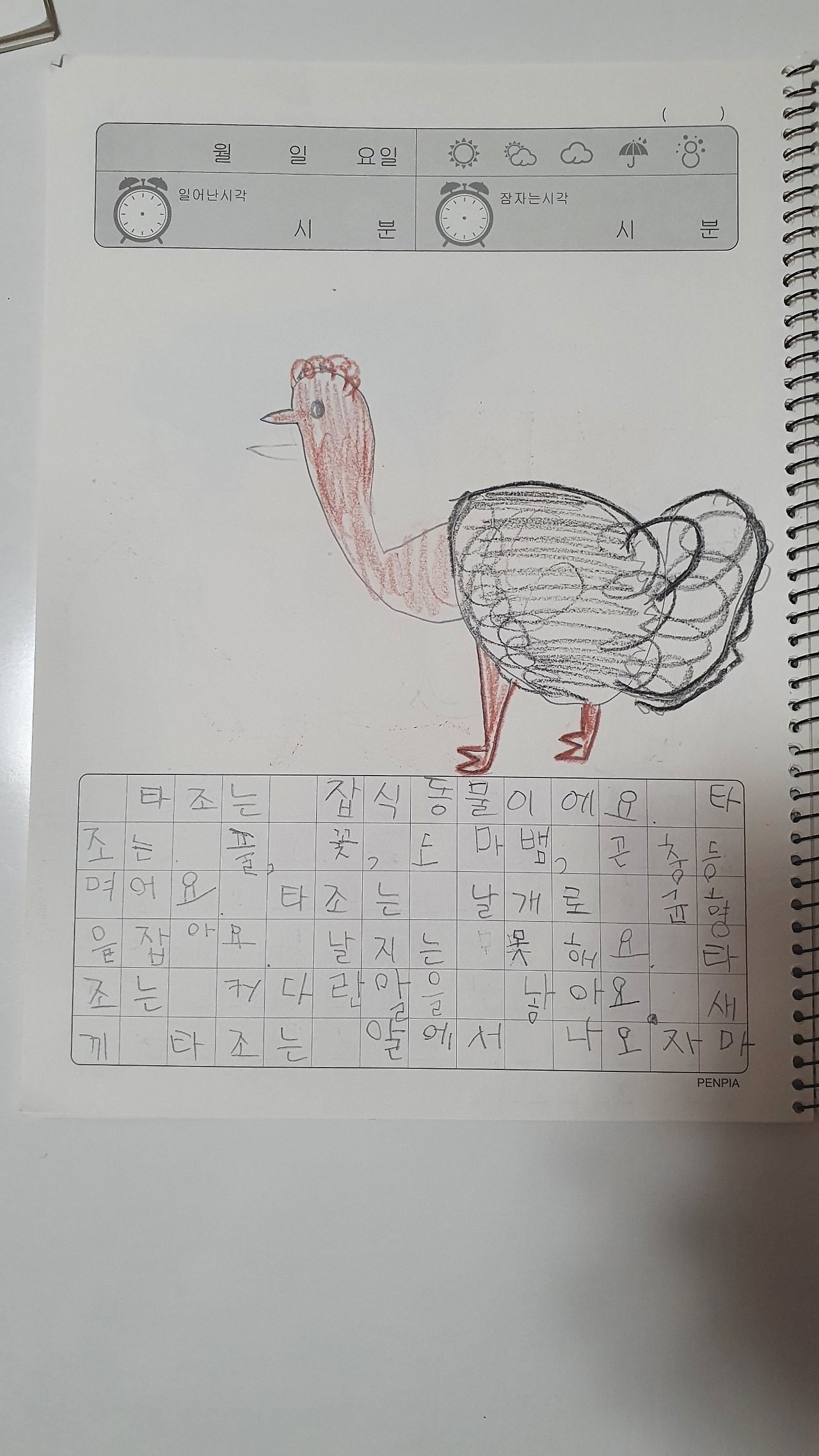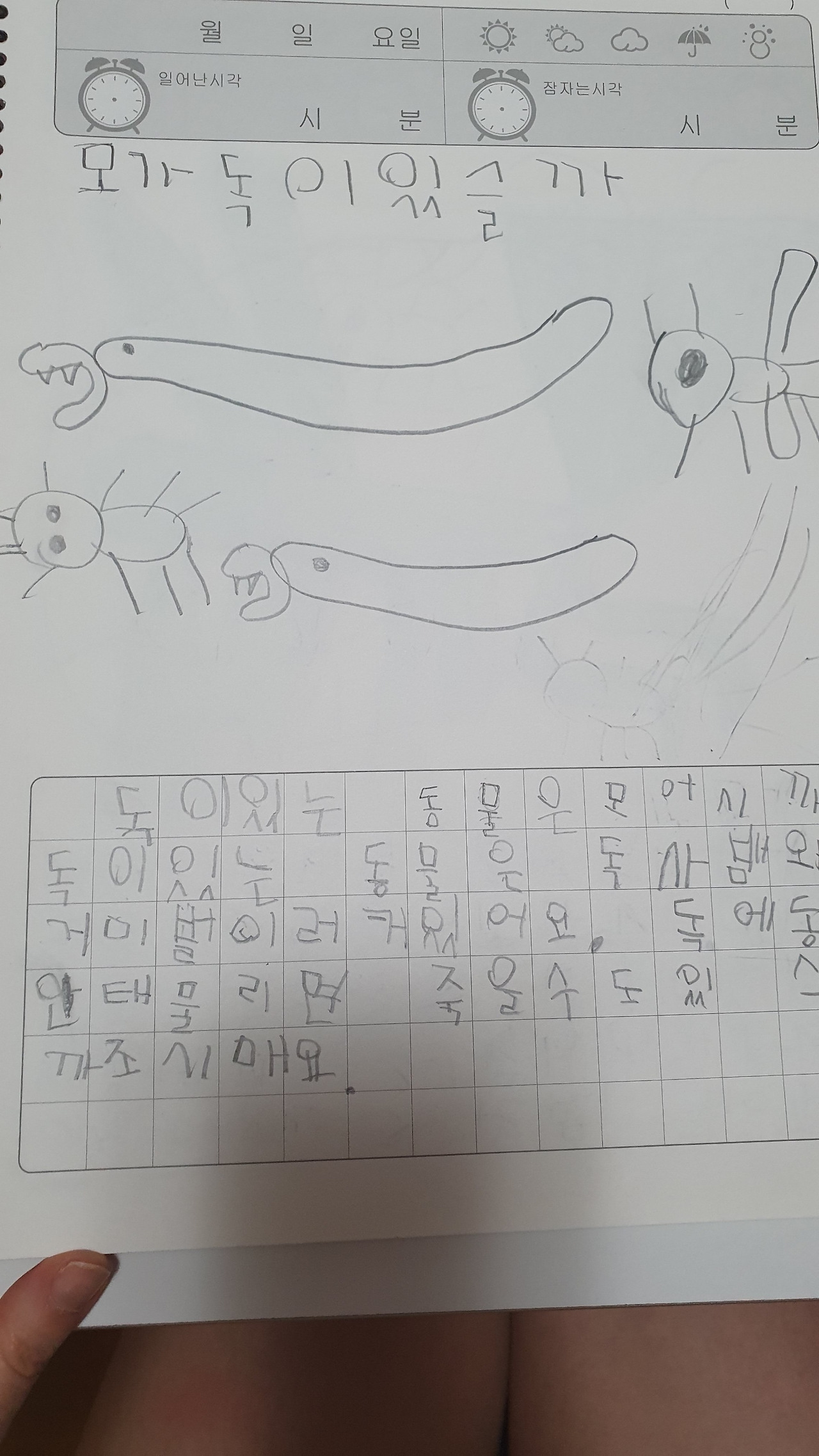 생물도감의 한 페이지, 아이가 쓴 정확한 제목은 생물독암이다. 조시매요. 이런 맞춤법 오류는 너무 귀여워서 고쳐주기가 싫었다.