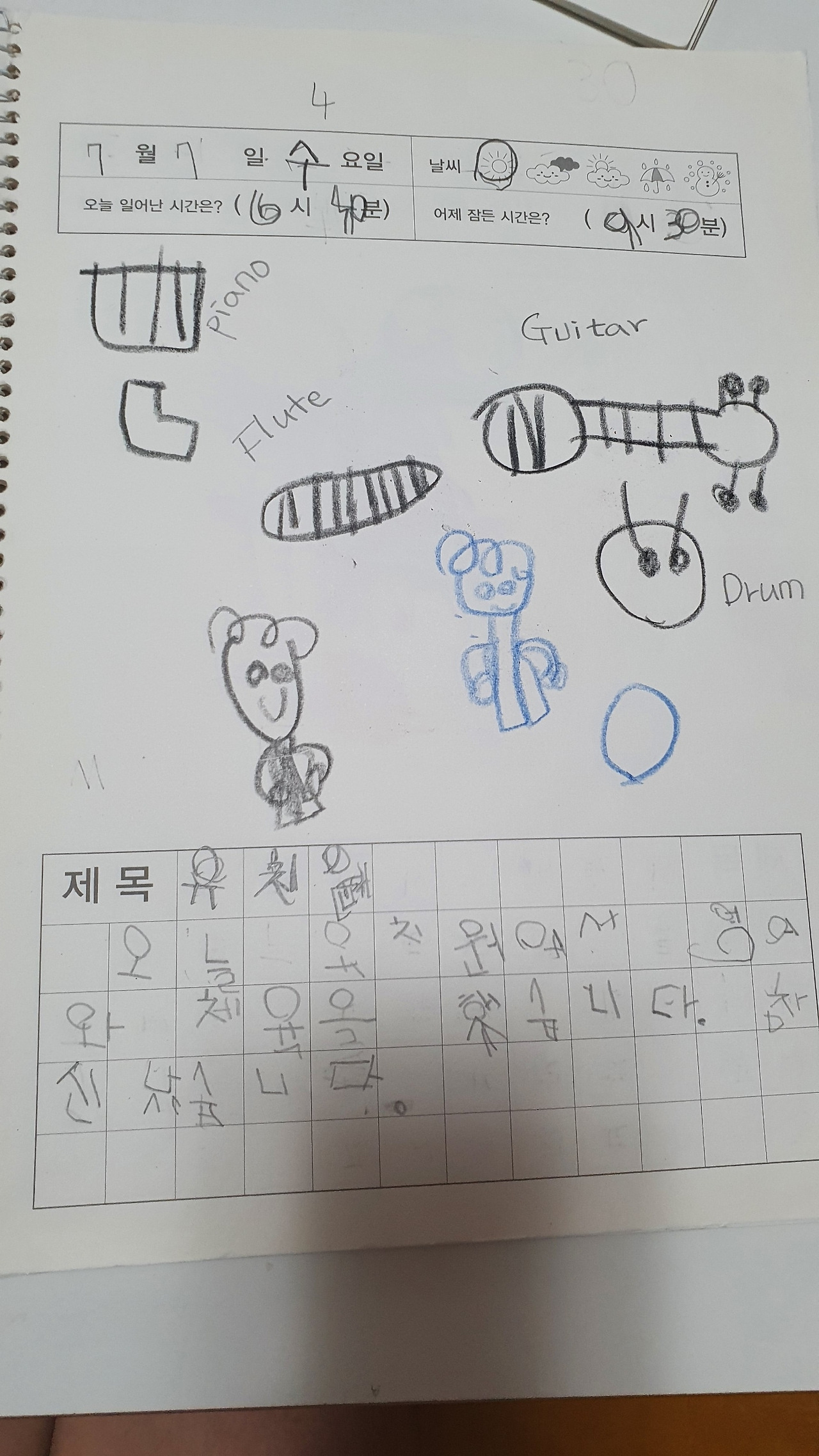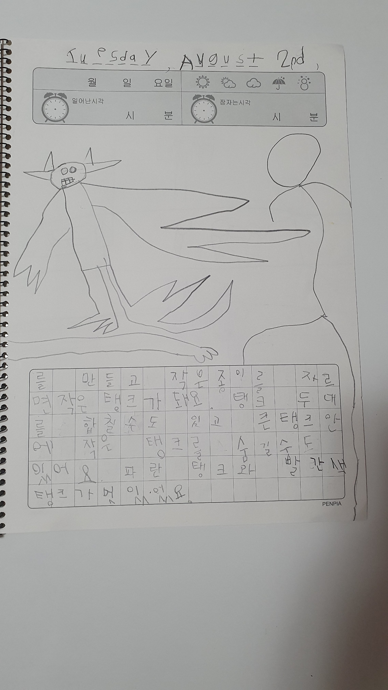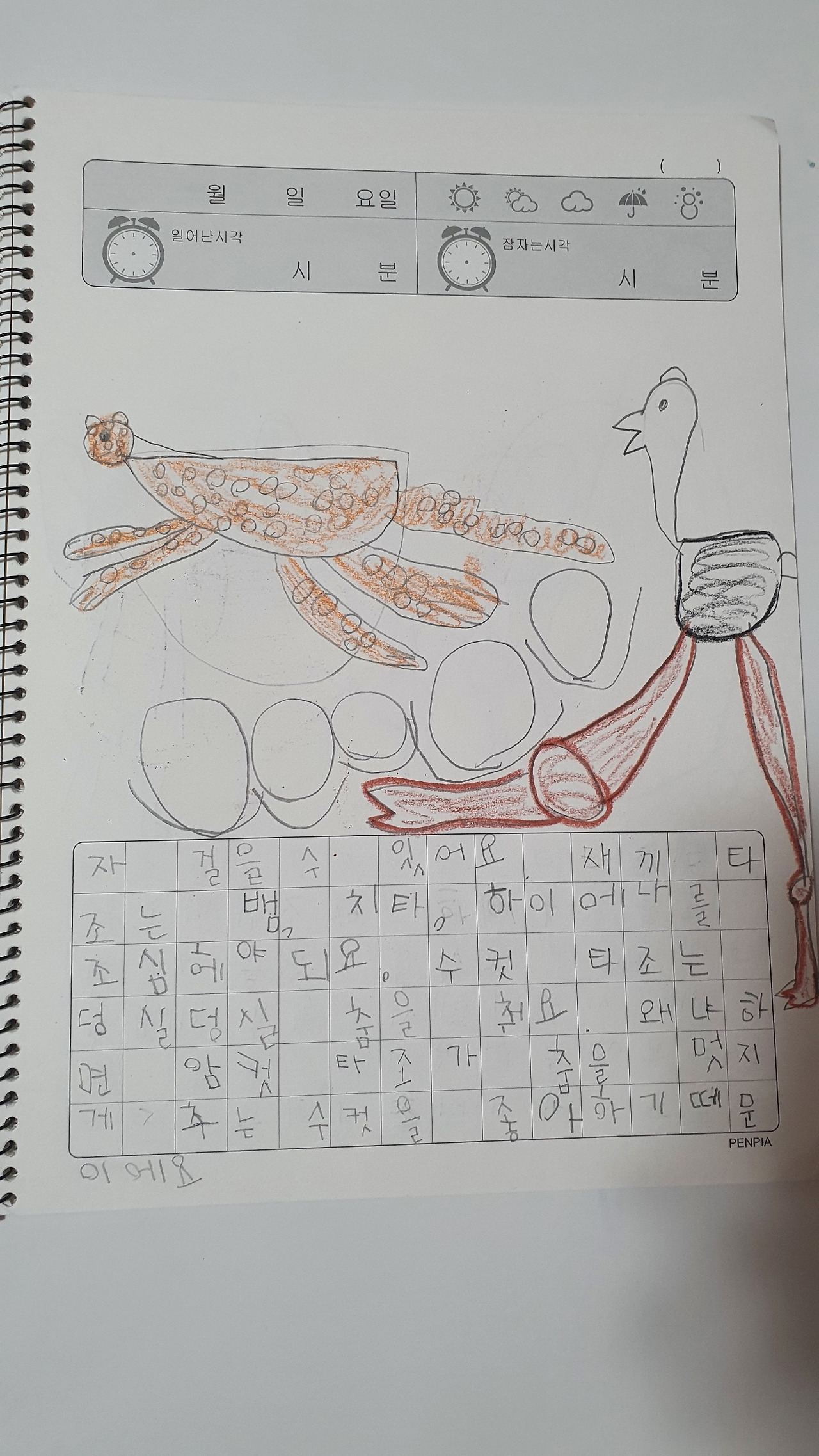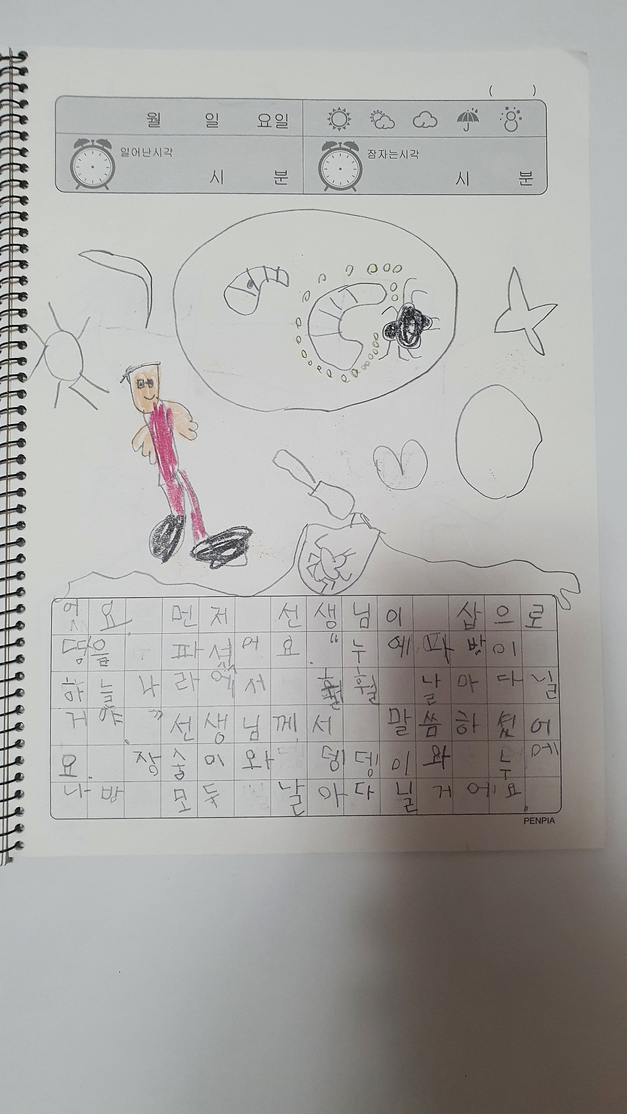 생물도감의 한 페이지, 아이가 쓴 정확한 제목은 생물독암이다. 조시매요. 이런 맞춤법 오류는 너무 귀여워서 고쳐주기가 싫었다.