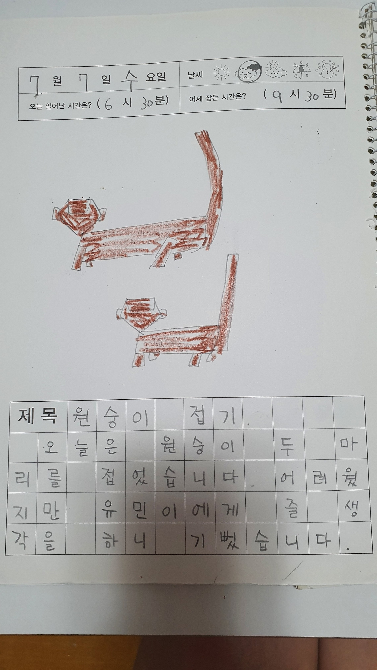 처음에는 내가 먼저 한 페이지를 쓰고 엄마의 글씨를 읽게 하고 두번째 페이지에 아이의 일기를 함께 썼다. 웅얼웅얼 횡설수설 하는 말을 한 문장으로 구성하여 쓰는 연습으로 시작하여 맛있었다, 재미있었다, 를 제외한 다양한 어휘를 사용해보기, 접속사를 알맞게 사용하기 등으로 국어공부를 하는 셈이었다.