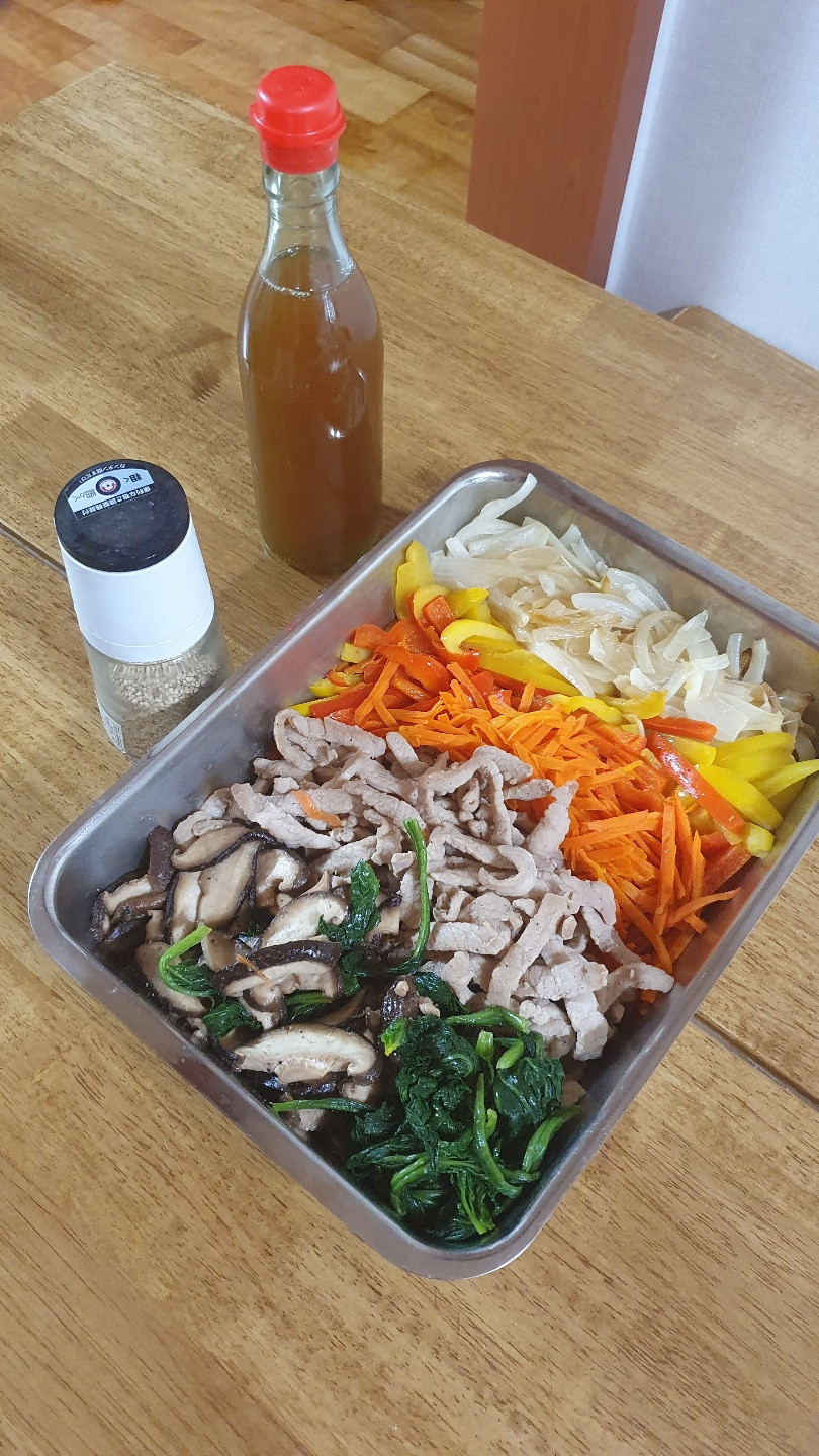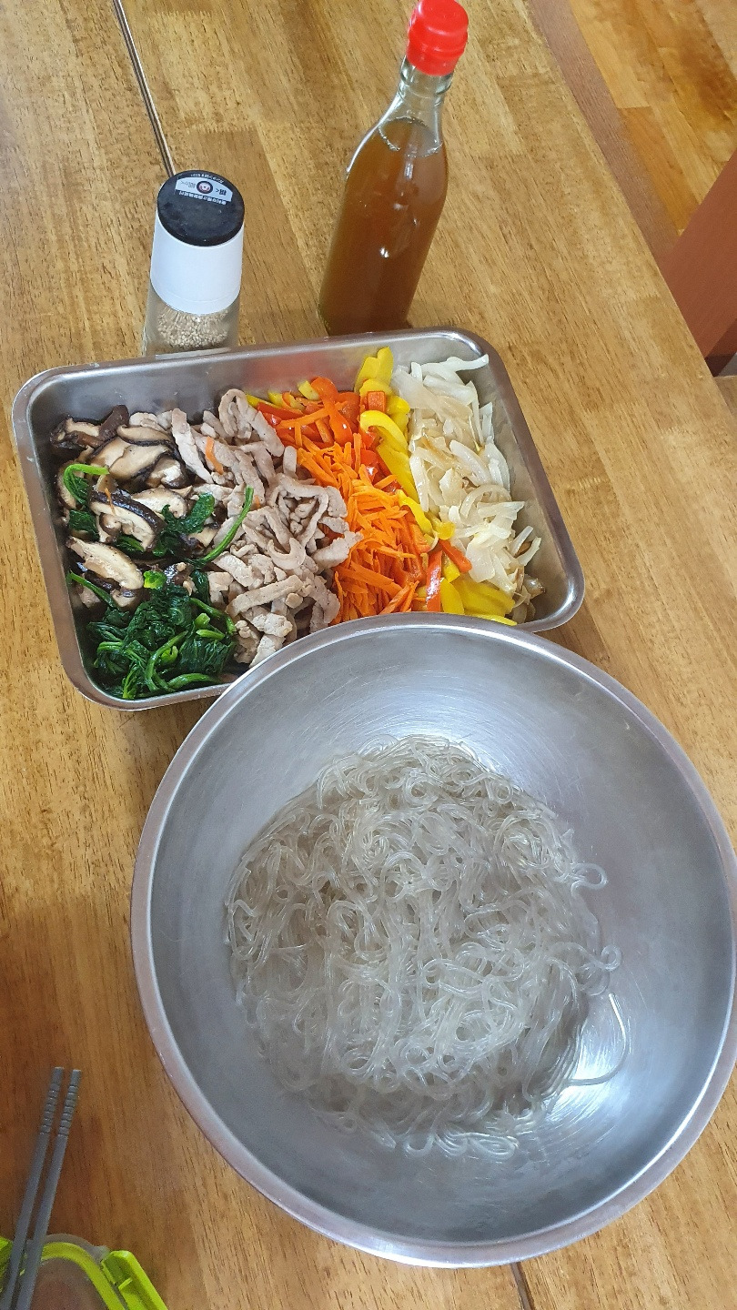 몇 번의 시행착오 끝에 나만의 잡채 레시피가 완성 단계에 올랐다. 바로 채소를 왕창 볶아 스텐 밧드에 담아 냉장고에 넣어 놓고, 먹기 전에 한번 먹을 만큼의 당면만 삶아 뜨거운 김에 차가운 채소들을 함께 무치는 것. 뜨거운 물에서 바로 건진 당면의 열기에 냉장고 안에 차갑게 있던 볶은 재료들이 따뜻해지고, 간장과 참기름으로 간 맞추기만 마무리하면 한 끼 잡채가 완성된다. 이번 둘째의 생일에 준비한 잡채 재료로 잡채를 세 번 해 먹었는데 세 번 다 미리 볶아 둔 재료들을 이용해 당면만 그때 그때 삶아 새로 무친 잡채를 맛있게 먹었다. 남은 채소로는 함박 스테이크의 소스에 넣기도 하였고, 마지막 조금 남은 잡채는 가위로 작게 조사서 계란말이를 해 먹으니 일주일간 잡채 재료로 집밥 해 먹기가 조금은 수월 하였다.