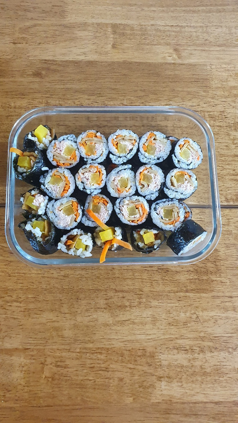 어제 먹은 김밥도 남은 어묵 볶음에 참치, 당근, 단무지만 들어간 뚝딱 김밥이었다.