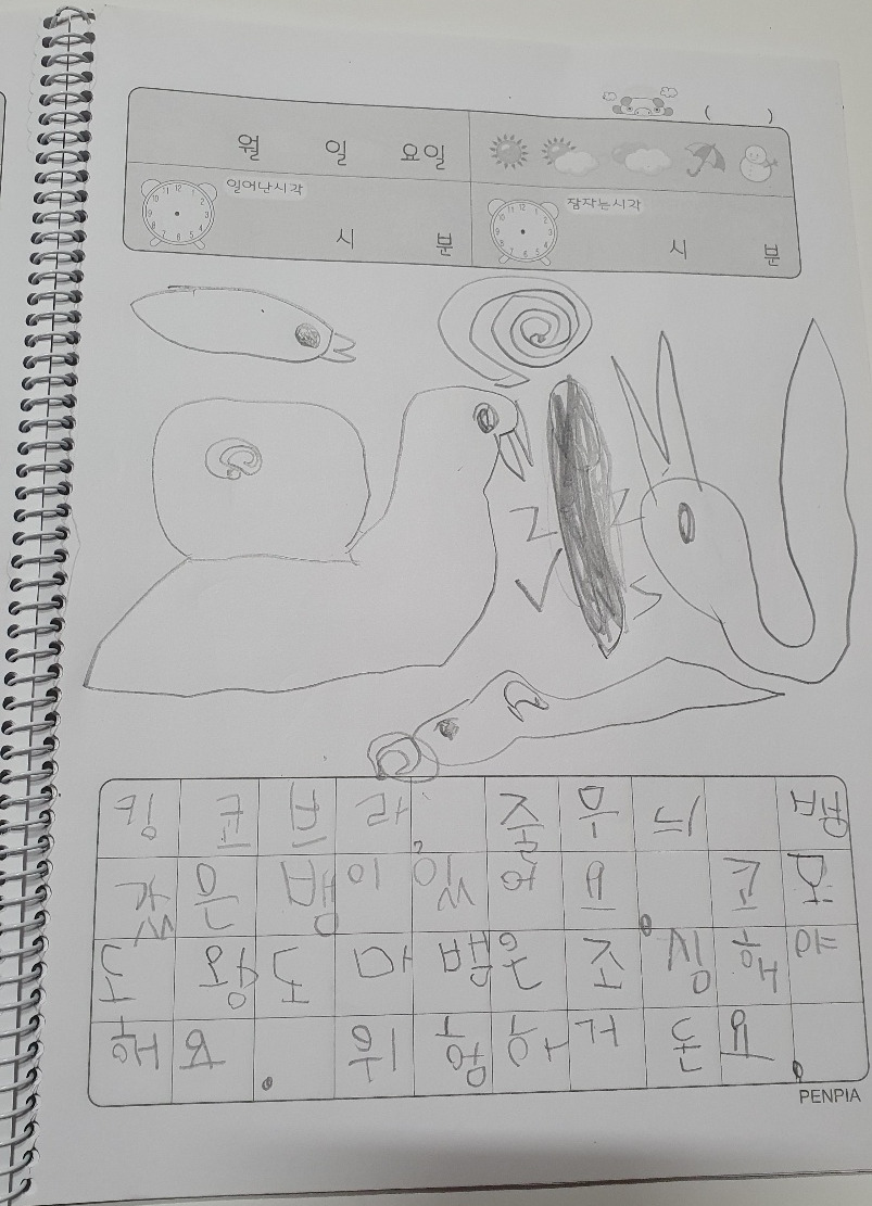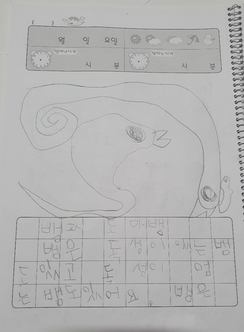 그런데 띄어쓰기는 조금 얘기가 달라진다. 그날그날의 마음 가짐이 아니라 정말 몰라서, 익숙지 않아 생기는 실수 이기 때문에 그때그때 알려줘야 하는데 솔직히 조금 귀찮다. 사실 나도 다는 모른다. 왜 띄어야 하냐고 묻는데, 이것 역시 규칙이기 때문에 정해진 대로 써야 하며, 그렇지 않으면 틀리다고, 그러나 네가 아직 어리고 배우는 과정이니 봐주는 거라고 나름 단호하게 선을 그었다. 한글은 아직은 깍두기공책을 사용하기 때문에 띄어쓰기의 감이 있다. 언제 띄는지는 헷갈려도, 한 칸 띄는 것은 안다. 한 칸이 어느 정도인지 가늠할 수 있기에 그냥 줄 공책이나 줄 없는 공책에도 어설프지만 띄어 쓰려 노력한 흔적이 보인다.