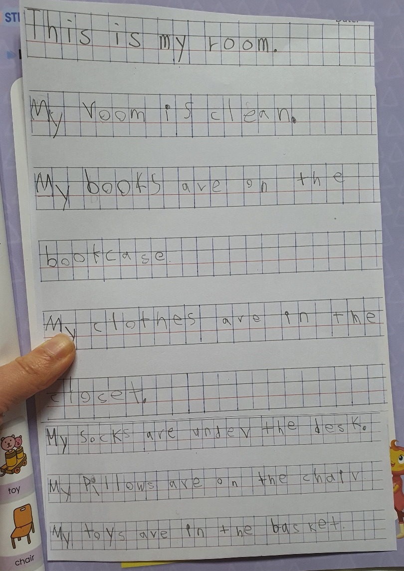 문제는 영어이다. 사실 내가 문제라고 해서 문제이지, 일곱 살짜리 영어 문장 쓰기에 문제라 할 것도 없다. 영어 공책이든, 일반 교재이든 한글 깍두기공책처럼 칸칸이 나누어진 공책이 아니다 보니 한 칸 띄는 것을 감을 잡지 못하는 것이 귀여웠다. My 하고 한 칸 띄라고 했더니 여기에 한 칸이 어디 있냐며 당황하는 기색이 역력하다. 그럼 그냥 조금 띄라고 했더니 그 조금이 기분 따라, 컨디션 따라 천차만별이라 오늘은 큰맘 먹고 영어 줄 공책에 세로줄을 그었다. 15센티 자를 대고 말이다. 아이가 한 글자 크기를 생각하며 그 정도씩 하나하나 줄을 긋다 보니 허리도 아프고 눈도 침침하여 이것 역시 계속은 못 할 짓이라 한 페이지만 줄을 긋고 나머지는 복사를 하였다. 확대 복사로 몇 부, 보통 사이즈로 몇 부.