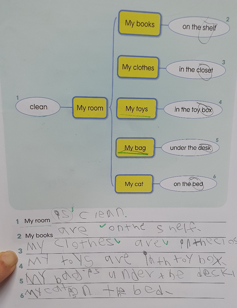 엄마 욕심으로는 글씨를 예쁘게 썼으면 좋겠다. 그런데 왜 글씨를 예쁘게 써야 하는지 아이를 설득할 만한 이유를 찾지 못해서 글씨를 알아보는 수준으로 쓰면 넘어가는 편이다. 글씨는 여러 사람이 함께 지키기로 한 약속이니까 정해진 대로 써야 하고, 다른 사람이 알아보도록 쓰지 않으면 글씨로써 의미가 없으니 예쁘진 않아도 또박 또박은 강조한다. 사실 이 부분은 아이의 마음가짐에 따라 어느 정도 조절이 가능한 부분이다. 웬일로 삐져나온 글씨를 지우고 예쁘게 고치는 날이 있고, 왼손을 주머니에 꽂아 놓고 오른손으로만 끄적끄적 칸을 채우는 날도 있다. 웬만하면 넘어간다. 나도 시시각각 내 마음이 갈대처럼 흔들리는데 아이가 오죽하랴, 충분히 이해한다. 그저 놀다가도 부르면 와서 십분 앉아 있는 것이 용하다.