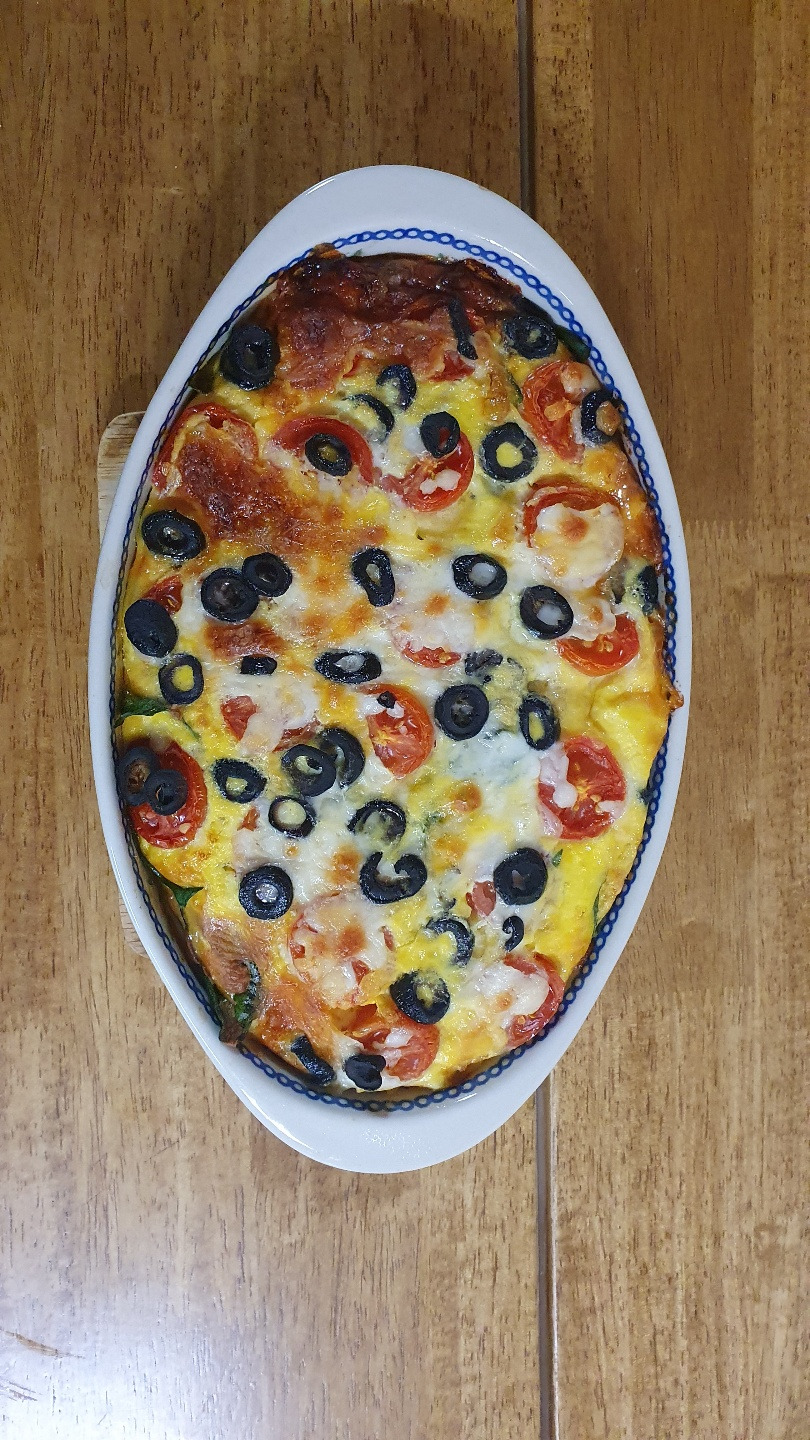 시금치 프리타타는 요리는 알고 있었지만 만들기는 처음 만들어 보는 것이었다. 이런저런 레시피를 둘러보니 이탈리아식 채소 오믈렛이고, 냉장고 채소 털이로 정해진 재료가 아닌 그냥 그때그때 있는 것들을 사용하는 듯했다. 나도 채소 재료는 일단 씻어 둔 시금치, 양파, 방울토마토, 팽이버섯, 올리브 슬라이스를 사용하였다. 버터에 양파만 살살 볶다가 시금치와 팽이버섯을 넣고 한 숨 죽이고, 오븐 용기에 넣은 뒤 계란 물을 붓는다. 계란 물에는 맛있으라고 생크림을 섞었고, 간이 되라고 파마산 치즈가루를 넣었으며, 아이들이 좋아하는 피자치즈를 계란물을 붓는 중간중간에 섞어 넣었다. 맨 위엔 토마토 썰은 것과 올리브 슬라이스를 올리고 또 한 번 치즈를 올리니 근사하게 세팅이 된다.