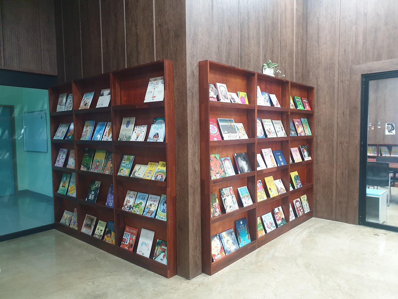 전면 책장에 꽂혀있는 그림동화는 잠깐 쉬어가는 우리 같은 사람에게 잠깐의 쉼을 선물한다.