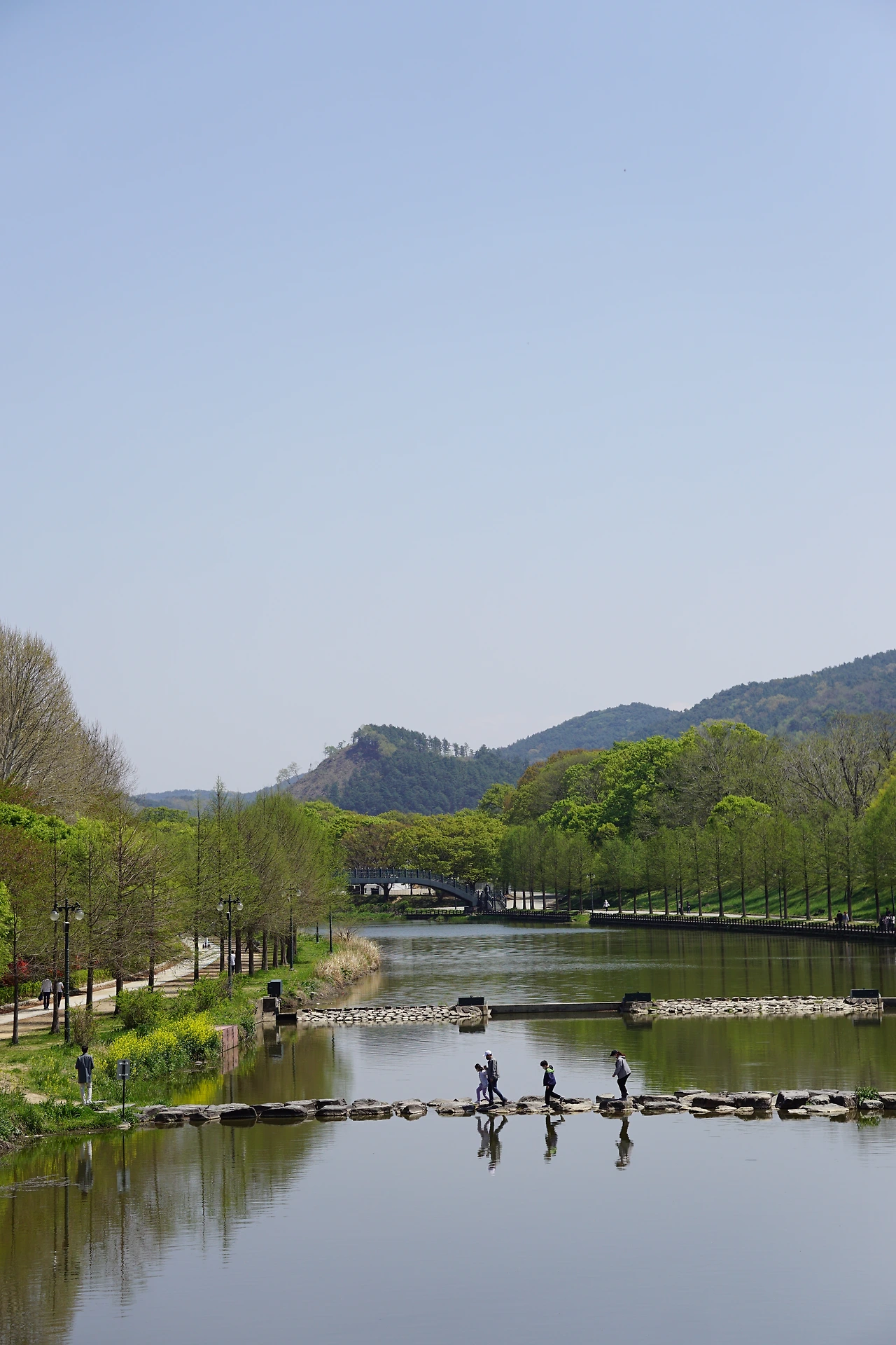 가는 길은 강물에 나무가 반영하여 풍경의 깊이를 더해준다. 초봄의 옅은 초록색은 여름이 지나 짙어져 가을이 오면 붉고 노랗게 물들을 것이다. 빛을 받아 강물에 퍼지는 윤슬은 강물을 건너게 해주는 징검다리를 걷고 싶을 수밖에 없게 만들었다. 돌아오는 길에 징검다리를 건너야지 다짐하며 둑길을 걷고 또 걸었다.