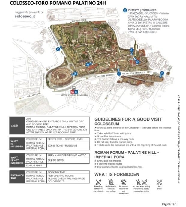 오전에 황제&교회를 테마로 하는 관광은 공식적으로 마감하고, 아내와 둘이 어제 못 가본 '콜로세움 내부모습, 팔라티노언덕, 포로 로마노 걷기' 투어를 아래 표를 별도 구매해서 관광했습니다.