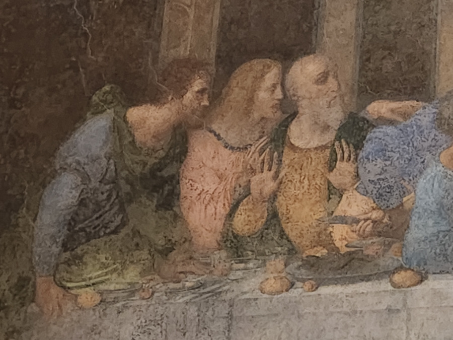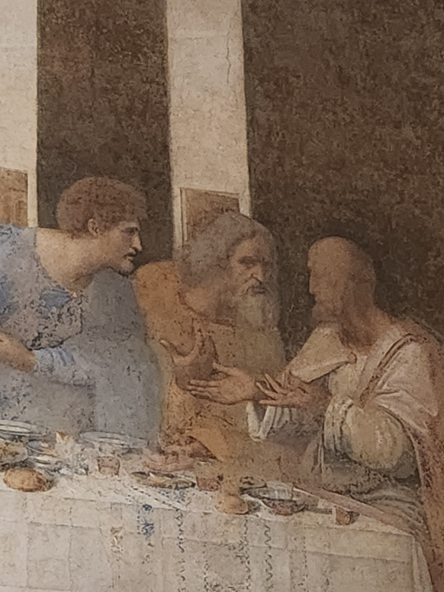레오나르도 다 빈치의 <최후의 만찬>을 제대로 이해하려면 각 인물들의 손 모양을 보면 됩니다. 레오나르도의 친구 중에는 말 못 하는 친구가 있었는데, 레오나르도는 이 친구를 통해서 수화법에 배우게 되었고, 수화를 응용하여 손만 보고도 성경 속 인물들이 누구에 해당하는지 쉽게 알 수 있도록 표현하였습니다.
