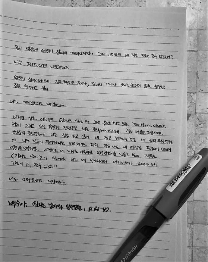 이 점의 밤이 눕거나 앉아서 기다렸던 -이제 막 잘 생각나지 않게 된- 다른 밤들과는 다르다고 기뻐했다. 밤과 밤사이를 이어보았고 그런 선들이, 선들이 하나의 원, 혹, 은, 점이 되도록 무엇이든 빛날 수 있도록.