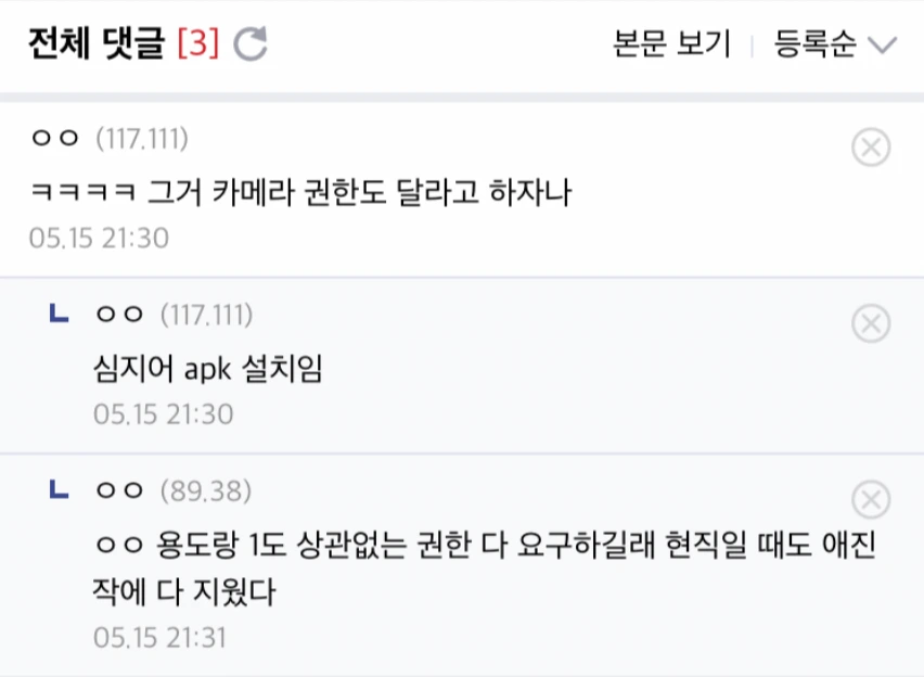 스토어에서 다운 받는 일반 앱들의 경우 설치하면 위치, 사진, 동영상, 사용하는 다른 앱들 트랙킹 등 '동의'를 받고서 사용자가 '허가'하면 그때부터 개인정보가 수집된다. 하지만 이런 url 링크를 통해 다운 받는 APK들은 기본적으로 개인정보 동의가 필요 없다. 왜냐하면 사용자가 스스로 동의해서 다운받았다고 판단하기 때문에 그 리스크에 대해서는 온전히 사용자가 책임을 지게 됨.