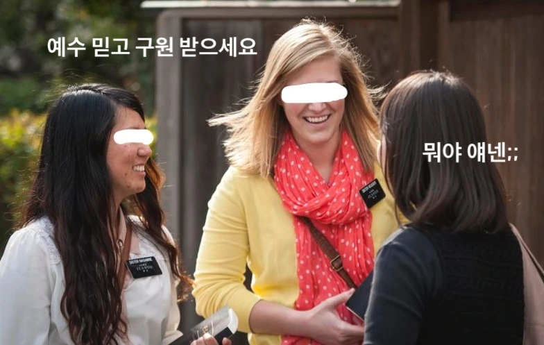 그녀들이 동네에 돌아다니면 사람들이 수근덕 거리며 쳐다보곤 했는데 외국인이 신기해서 쳐다보는 게 아니라 요즘 같이 신천지, JMS 등 사이비로 민감한 때에 사이비 명찰을 걸고 돌아다니니 '뭐야 쟤넨'하는 눈빛으로 쳐다봤다.