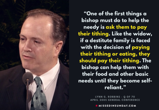 “감독들이 가난한 회원들을 돕기 위해서 먼저 해야 하는 것은 그들에게 십일조를 내라고 하는 것입니다. 재정적인 형편이 없는 미망인처럼 어떤 가족이 재정적인 어려움을 겪을 때 먹을 것을 사는 것과 십일조를 내는 것 중에 하나를 선택해야 한다면 십일조를 내야 합니다. 그 가족이 자립할 때까지 감독은 음식이나 생필품을 주며 도와줄 수 있습니다.”