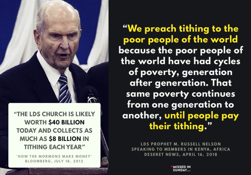 빈곤에서 벗어나려면 수익의 십 분의 일을 80대 백인 남자들이 운영하는 교회에 바쳐야 벗어날 수 있다는 주장이 논리적으로 말이 되는가? 위대하고 자비로운 몰몬교 신은 불우한 그들의 신앙심을 돈으로 시험하는 이유는 뭘까? 넬슨 회장의 주장대로 가난에서 벗어나려면 십일조를 내는 것이 제일 좋은 방법일까? 답은 No다. 십일조를 내는 것은 세금을 내는 것과 달리 연말정산 때처럼 환급금을 돌려받는 것이 아니다. 본인이 내는 십일조는 교회에서 마음대로 쓸 수 있기 때문이다. 신도에게는 그 십일조를 어디에 쓰느냐에 대한 선택권이 없단 말이다.