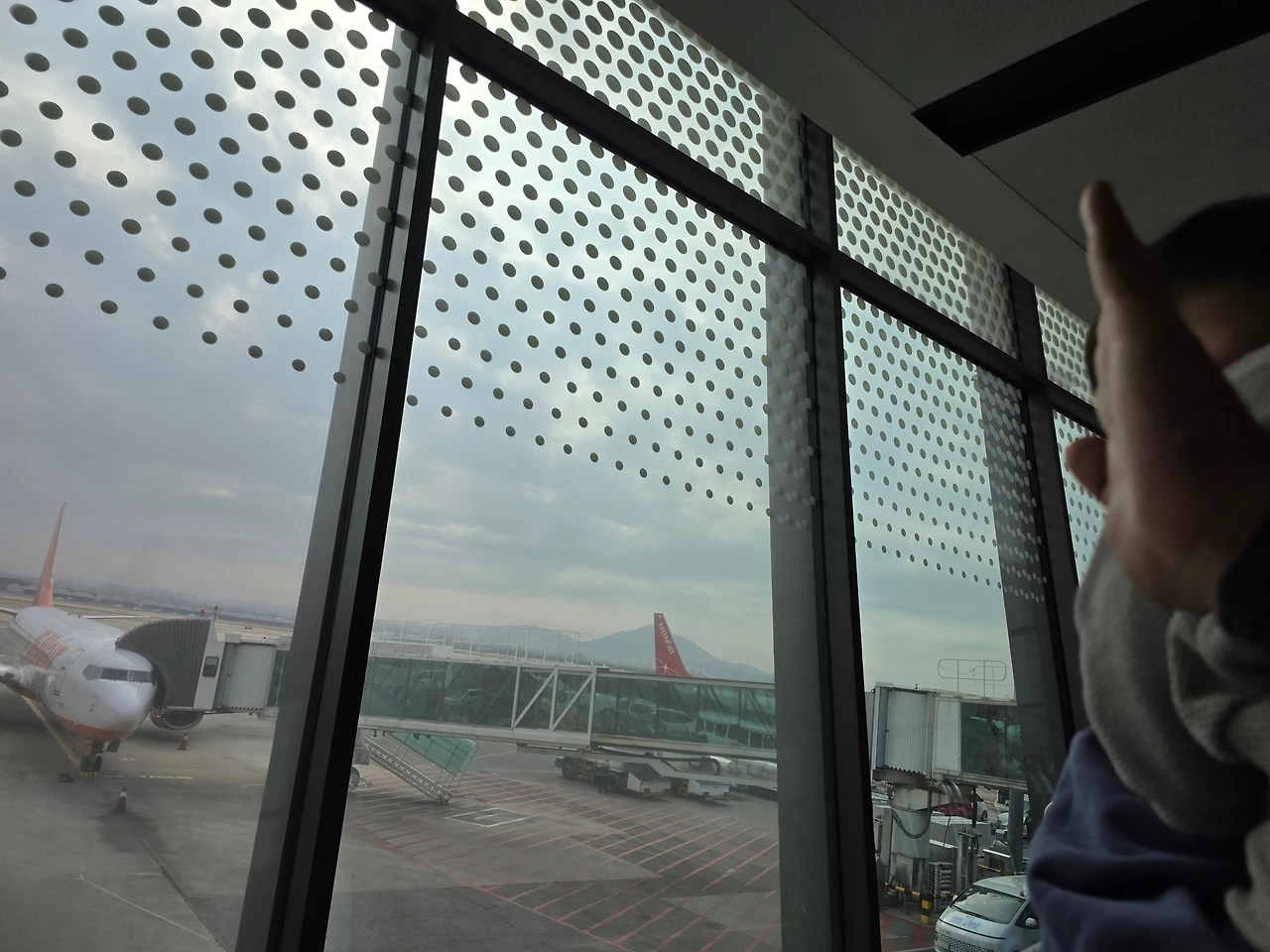 비행기와 공항은 그 존재 자체로서 설렘을 선사한다. 크고 작은 짐들을 부리며 이리저리 분주히 움직이는 수많은 사람들, 소리는 크지만 뭐라고 하는지 알아들을 수 없게 웅웅대는 (주로 사람을 찾거나 탑승구가 변경되었다는 내용의) 안내방송, 창 밖에서 일개미처럼 이리저리 움직이는 지상조업 자동차들, 쉴 새 없이 뜨고 내리는 비행기들... 평소 탈것을 좋아하는 첫째는 연신 '우와! 우오! 슈우웅!' 소리를 연발하며 공항 창가에 들러붙어 비행기를 구경했다. 출근과 등원에서 벗어난, 청소기와 설거지에서 해방된 우리 부부는 첫째의 양손을 하나씩 잡고서 이스타항공 탑승구로 향했다.