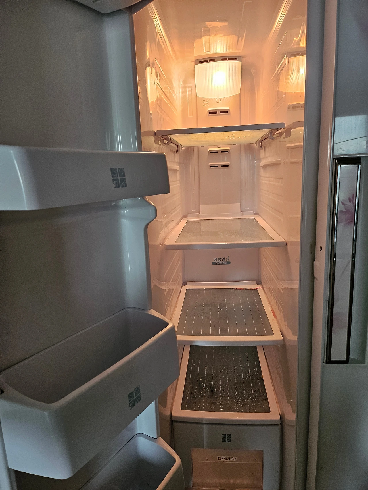 냉장고 상태를 보려고 앞으로 당겨진 냉장고 뒤가 보였다. 7년 동안 볼 수 없었던 냉장고 뒤를 보니 생각보다 별거 없네. 덩치 큰 냉장고 몸에서 나온 콘센트가 벽에 박혀 있었다. 그동안 냉장고 발을 묶어놨던 사슬을 끊어내는 기분으로 냉장고 콘센트를 뽑았다. 유일하게 불이 들어와 있던 냉동실 불이 꺼졌다. 저녁준비는 수월했지만 냉장고 정리에 녹초가 되었다.