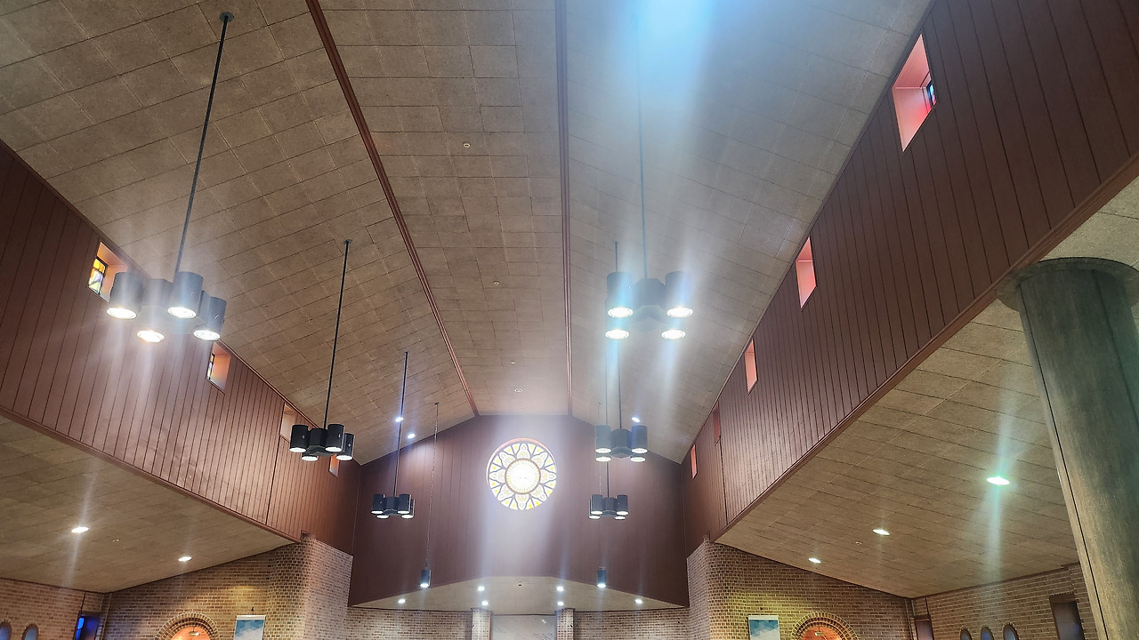 지각이 아니었다면 결코 눈에 들어오지 않았을 풍경이 또 있다. 그것은 고동색 나무 패널이다. 중앙의 비둘기 모양 원형 스테인드글라스가 그 패널 위에 나 있었다. 그 패널은 정면뿐 아니라 양옆 벽에도 이어지는데, 천장에서 약 2미터쯤 아래까지 내려왔다. 3층 채광창들도 고동색 나무판 위에 모습을 드러냈다. 그 나무 패널을 보고 있자니, 문득 노아가 비둘기를 날리기 위해 올라갔던 방주의 꼭대기 창이 떠올랐다. 물이 멎었는지 바라보던 그 창 말이다. 우리 성당 천정이 방주를 본떴다니 새삼 놀라웠다.