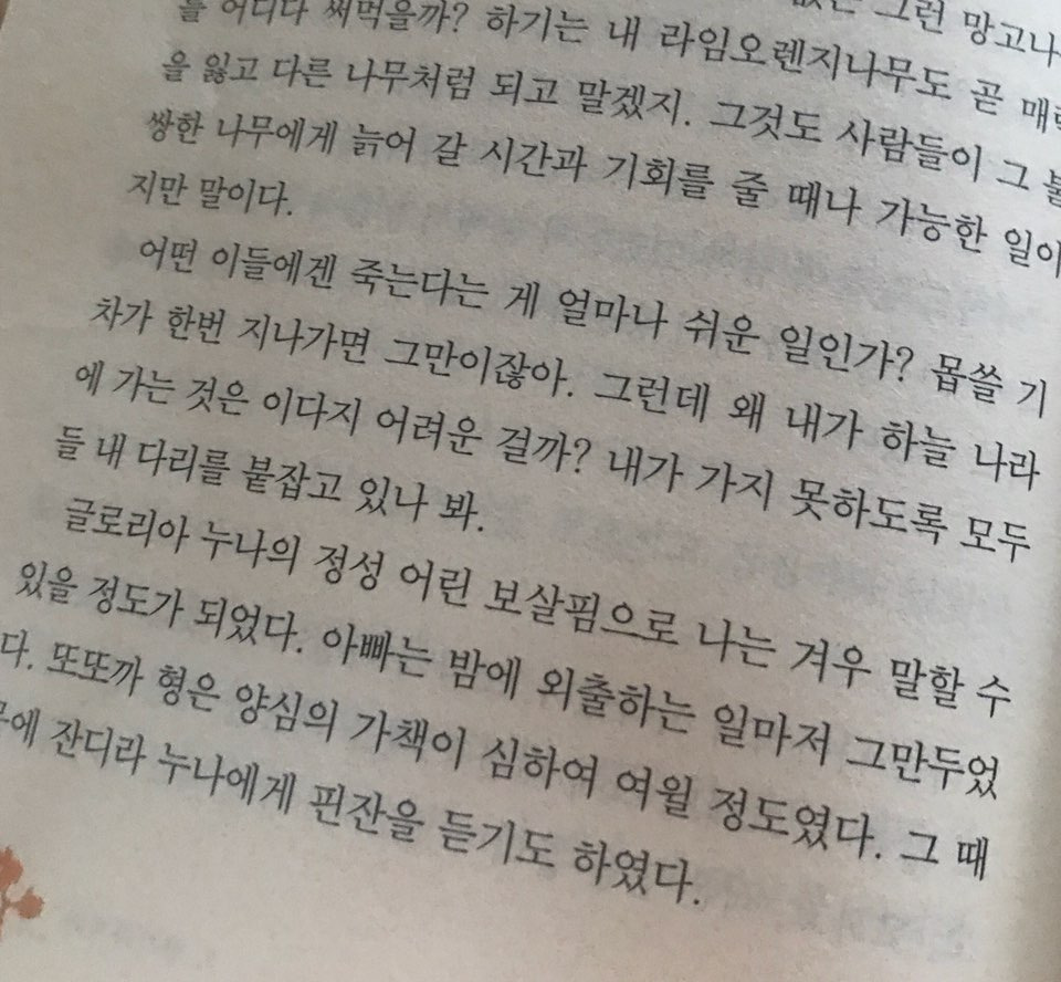 성질이 극에 달할 때면 나와 자신의 아이들을 때리곤 했다. 물론 내가 더 많이, 자주 맞았다. 맞는 이유는 가지각색이었다. 매일 단어 열다섯 개를 선별해 외웠어야 했는데 꾀를 부리고 싶었던 나는 'coffee'를 썼다. 쉬운 단어를 썼다고 맞았다. 밥을 먹었다. 너무 게걸스럽게 먹는다고 맞았다. 살이 좀 올랐다. 살이 쪘다고 맞았다. 읽고 싶은 책이 있다 말했다. 눈치 주는 거냐며 맞았다.