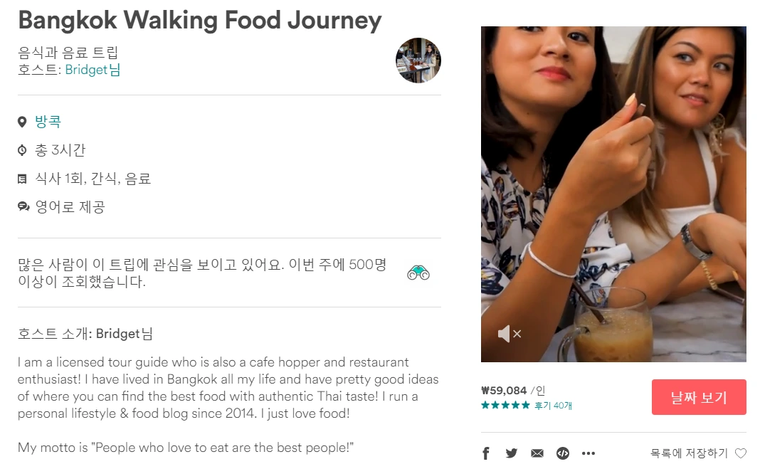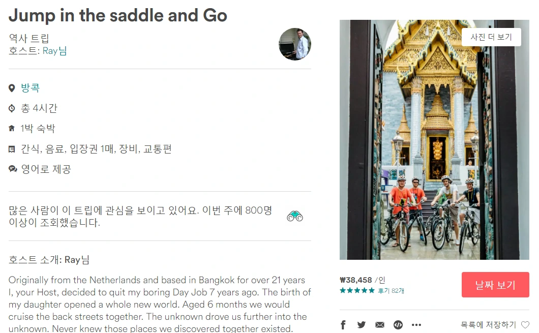 앞서 언급했듯, 방콕은 처음 방문하는 것이었기 때문에 '방콕 유명 관광지 방문'과 '방콕에서 경험할 수 있는 특별한 경험' 두 가지로 선정했다. 때문에 에어비앤비 트립도 그 목적에 부합하는 '방콕 시내 자전거로 둘러보기'와 '방콕 길거리 음식 체험'을 선정했다. 에어비앤비 트립의 경우, 현지인이 제공하는 것을 바탕으로 하기 때문에 대부분 한국어 서비스를 제공하고 있지 않다. 때문에 현지어 혹은 영어를 모른다면 투어를 참가하는 것이 불편하다는 단점이 있다. 참고로 필자가 직접 경험해본 두 개의 트립은 모두 영어로 진행됐다.