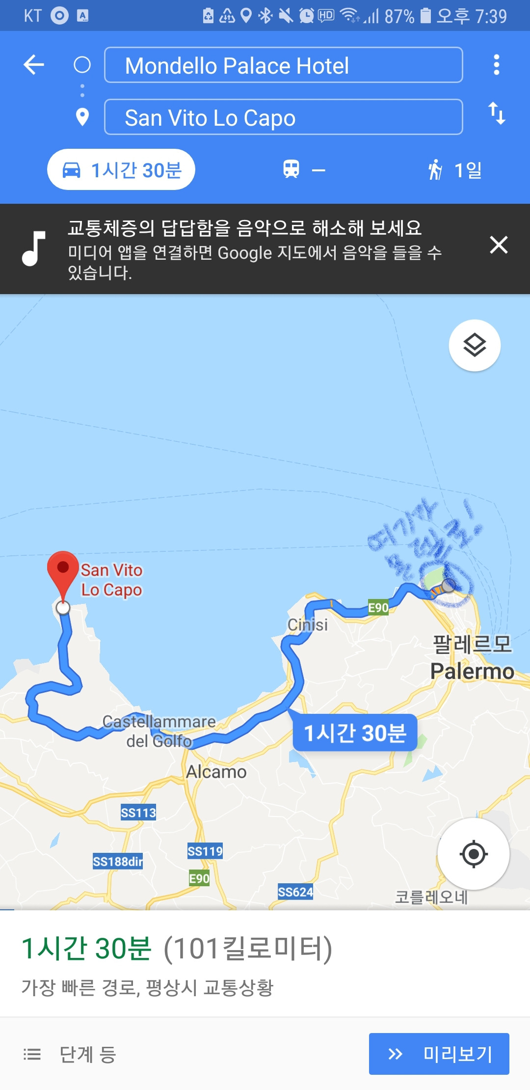 지도로는 1시간 반.