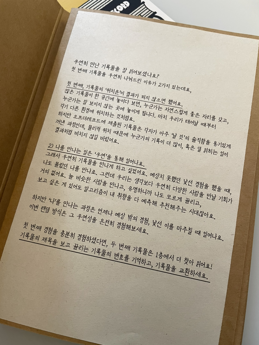 지난번에는 방해꾼을 탐험하는 방식이었다면, 이번에는 우연에 깃대어 만나는 글 컨셉이었다.