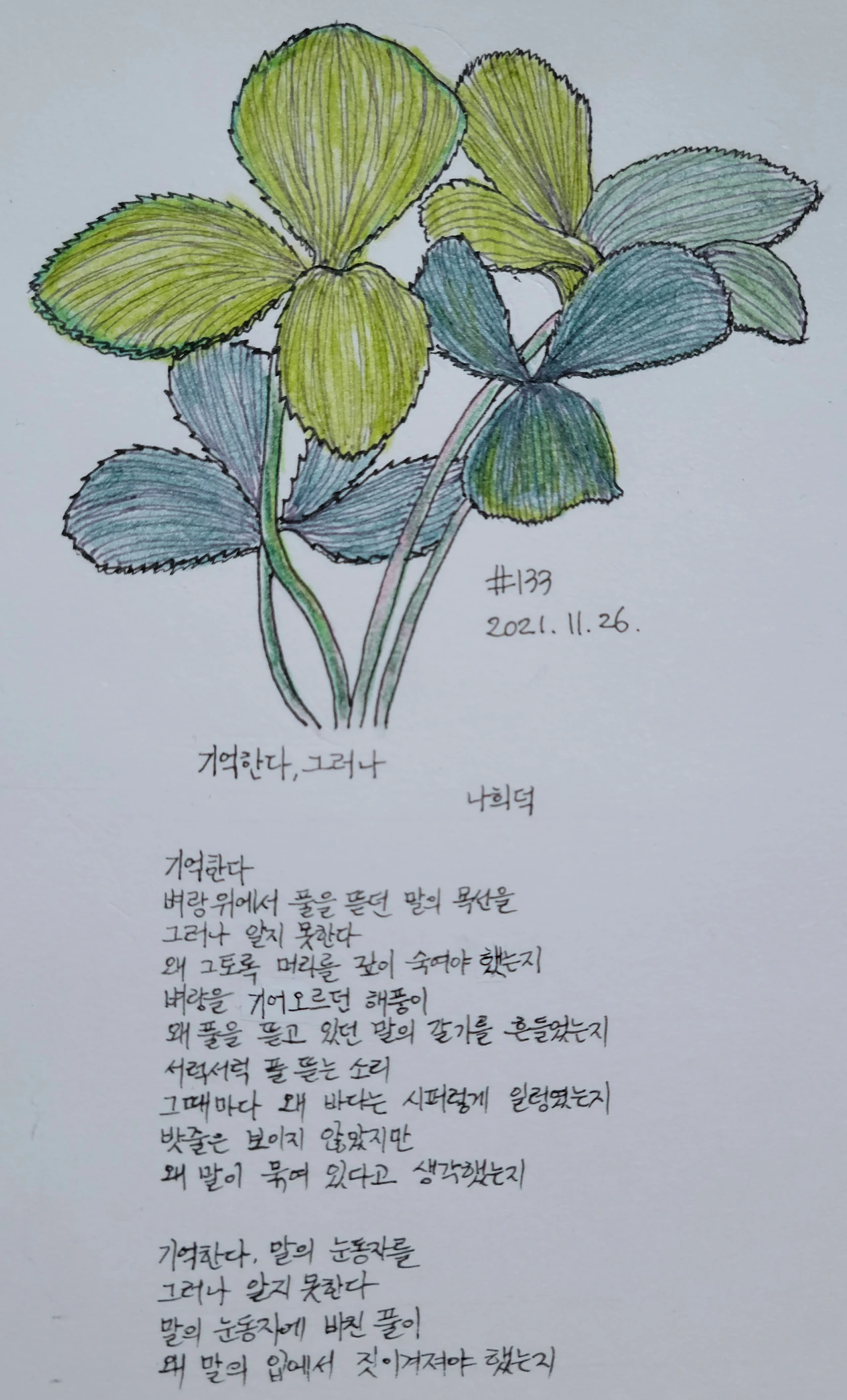 나는 기억한다는 말 앞에서 멍해지는 나를 발견한다. 기억한다는 다음 문장을 이을 수 없어 막막하다. 몇 가지 떠오르는 일이 있지만 기억한다는 말과 어울리지 않는다는 생각에 선뜻 꺼내놓지 못한다.