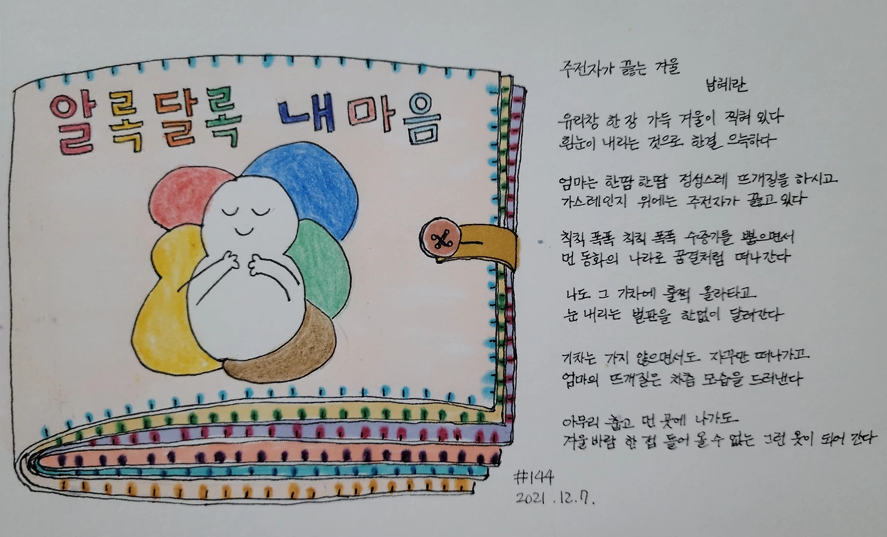 노을이 질 때 걸음을 멈추기만 해도, 말없이 누군가의 이름을 불러주기만 해도 기도하는 것이라는 이문재의 시가 있다. 음식을 오래 씹기만 해도 그믐달의 어두운 부분을 바라보기만 해도, 나는 결코 혼자가 아니라는 사실을 받아들이기만 해도 우리는 기도하는 것이라는 시인의 말에 고개를 끄덕이게 된다. 엄마가 한 땀 한 땀 정성스럽게 뜨개옷을 만드는 것도 기도하는 것이다. 누군가를 위해 난로를 펄펄 끓이는 것도 기도하는 것이다. 추위로 서리가 낀 뿌연 유리창으로 들여다보이는 실내가 편안하고 포근해 보이는 건 겨울이 선물하는 풍경이다. 난로 위 주전자가 뿜어대는 수증기는 칙칙폭폭 기차 연기가 되어 우리를 아늑한 곳으로 데려간다.