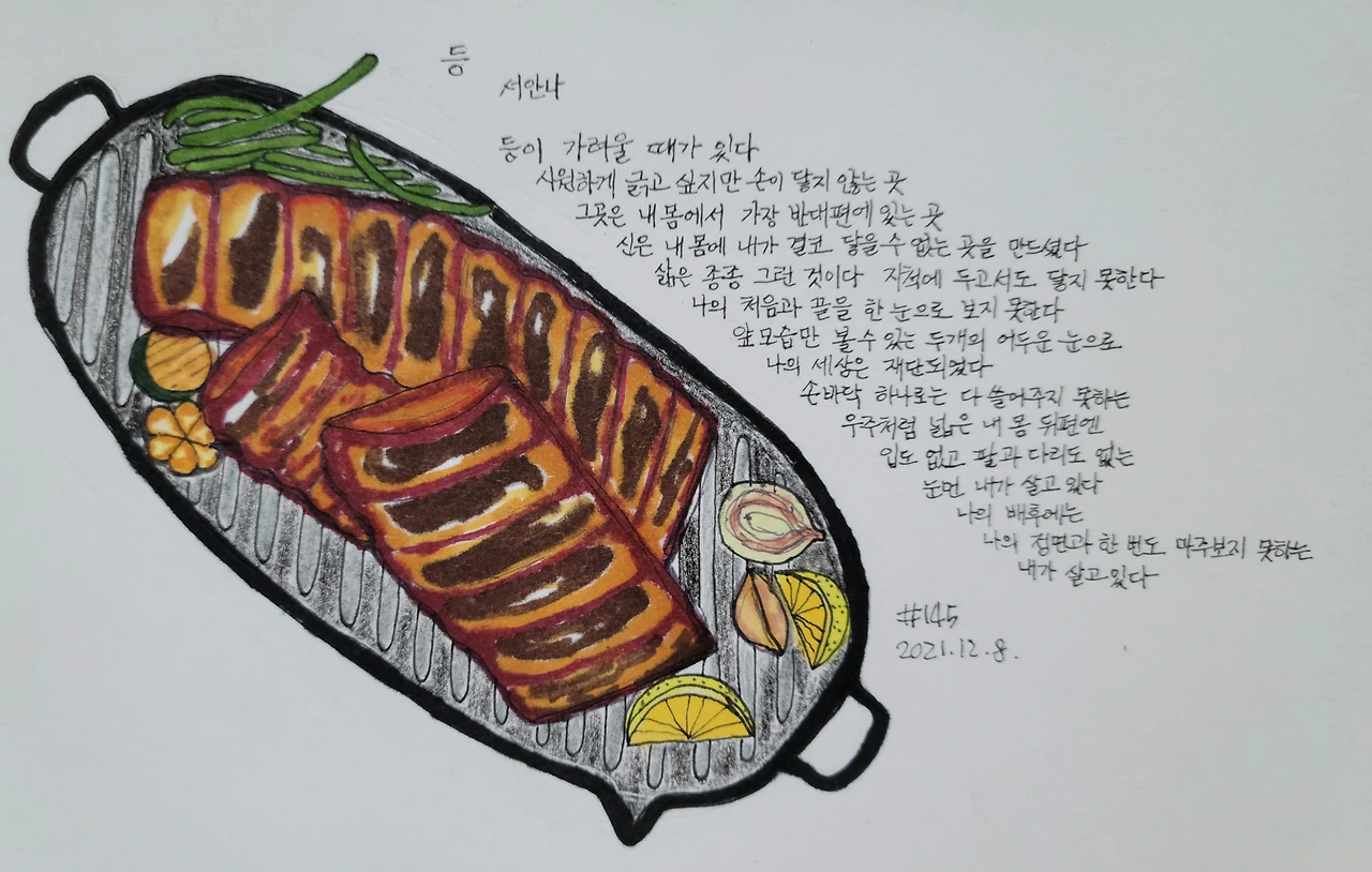 등은 정면으로 볼 수 없고 손으로 닿을 수 없다. 등은 내 몸에 가장 가깝지만 반대편에서 나를 등지고 나와 함께 살아가고 있다. 서로의 사이가 너무 가까워 객관적으로 바라보지 못하고 부정확하게 아는 일이 종종 있다. 자기에 대해 자신만 모르고 주변 사람들이 쉽게 알 수 있다는 것을 겸허하게 받아들일 줄 알아야겠다.