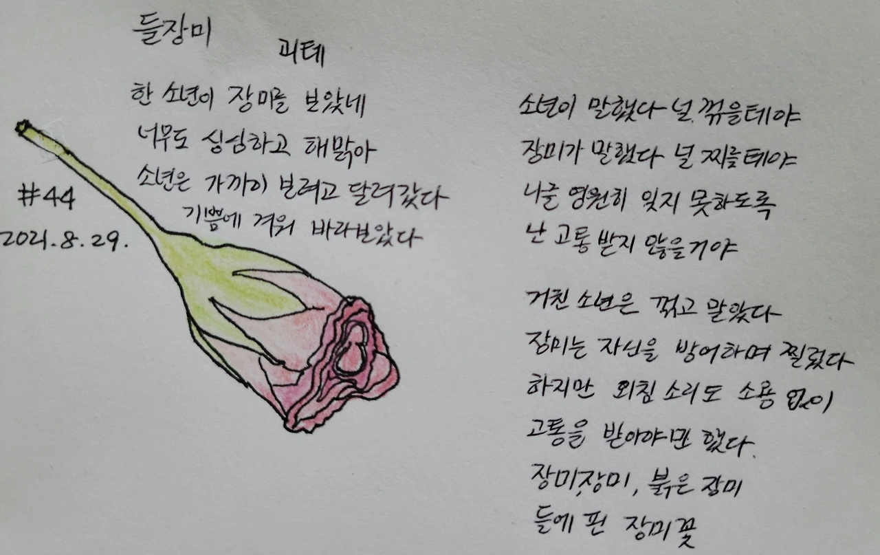 새벽부터 장대비가 내렸다. 길가 나팔꽃은 모두 떨어졌는데 들장미는 굳건히 피어있었다. 이래서 외로워도 슬퍼도 안 울고 참고 참고 또 참던 캔디를 들장미 소녀라고 불렀나 보다. 초등학생 때 만화광인 친구 집에 놀러 가 캔디 전집을 읽었던 추억이 있다. 친구네는 1980년대 유행하던 양옥집이었다. 다락방에는 삼면 벽을 따라 황미라, 원수연, 신일숙, 강경옥 등 그때 유명했던 만화가들의 전집이 꽂혀있었다. 우리 집에서 만화책은 등짝 스매싱당할까 숨어서 봐야 했는데.. 취향을 존중해주고 꿈의 환경을 만들어준 친구의 부모님이 그저 신기했다. 친구에게 만화책을 빌려보려면 조건이 있었다. 그 아이가 좋아하는 뉴키즈 온 더 블록 공연비디오를 함께 보고 수다를 떨어줘야 했다. 5명이 결성된 사연에 같이 열광해주고 댄스를 따라 하는 친구의 춤선을 진지하게 감상하고 평가해줬다. 그렇게 빌려온 캔디를 이불 뒤집 어쓰고 몰래 읽으며 숨도 안 쉬는 몰입감으로 울다가 웃다가 가슴 벅차다가 다음 책에 어떤 이야기가 나올까 궁금해서 잠을 못 자며 읽었다. 그런데 빵모자에 킬트를 입은 알버트 아저씨가 동물친구들에 둘러싸여 백파이프 불며 언덕에서 등장하고 캔디가 달려가 안기던 결말이 참 마음에 안 들었다. 테리우스와 연결되길 바랐는데.. 무대 조명이 떨어져 수잔나가 구해주는 바람에 어긋난 운명의 장난을 보며 진짜 사랑은 이루어지지 않을 거란 예감을 갖게 되었다.