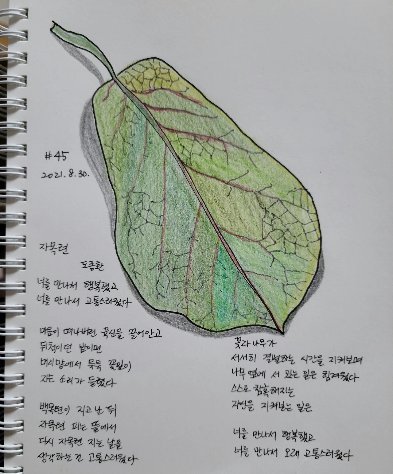 나뭇잎 하나 주웠다. 선녀 부채 같은 모양으로 시원스럽게 생겼다. 찾아보니 자목련의 잎이다.