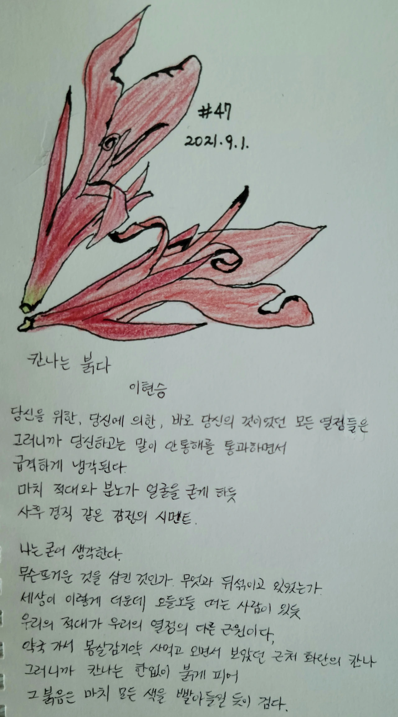<칸나는 붉다>에서 시인은 서로에게 열정을 다했던 두 사람이 어긋난 대화로 시멘트처럼 관계가 경직되어 버린 상황을 말한다. 적대감으로 얼굴과 생각이 굳고 몸이 차가워져 몸살감기약을 사러 갔다. 약국에서 돌아오는 길에 칸나를 봤다. 상대에게 품은 적대적인 에너지가 용암처럼 검붉은 칸나 속으로 빨려 들어가 용해되고 다시 연결되기를 희망하고 있다. 칸나가 친절한 손길로 몸살 나으라고 따뜻한 불을 지펴준다.