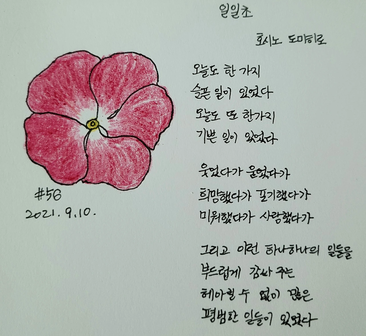 퇴근길 집에 들어오는데 일일초 한송이가 떨어져 있는 것을 보았다. 여름과 가을에 걸쳐 꽃이 매일 한 송이씩 끊이지 않고 피어서 일일초日日草 라고 부른다. 루소는 어머니와 산책하며 이 작은 꽃을 처음 보았고 어머니가 돌아가신 뒤에 산에 가면 이 꽃을 찾아 어머니를 추억했다고 한다. 루소 또한 고독한 산책자였다. 고독 속에서 자신의 내면을 마주하고 자신의 참모습을 수용하는 내적 성찰을 기록한 책이 그의 <고독한 산책자의 몽상>이다.